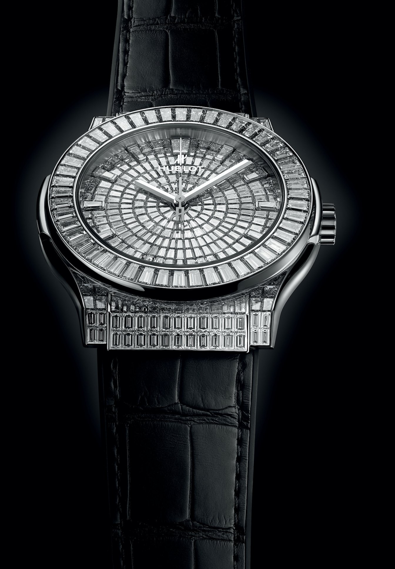 Cuenta con un engastado invisible que permite vislumbrar muy sutilmente el fondo de oro blanco de 18 quilates, nada menos que 391 diamantes (18,6 quilates) se engarzan en la totalidad del contemporáneo modelo Classic Fusion High Jewellery y generan un resplandeciente efecto hipnótico. Los índices y las horas están dispuestos en círculo en torno a las agujas, lo que crea una sensación de altura. Una composición de gemas de talla rectangular y en trapecio cubre toda la superficie de la esfera y converge en el centro. En su interior vibra el movimiento de cuerda automática HUB1710. La hebilla de la correa de piel de aligátor y caucho natural también está engastada con 36 diamantes (2,2 quilates).