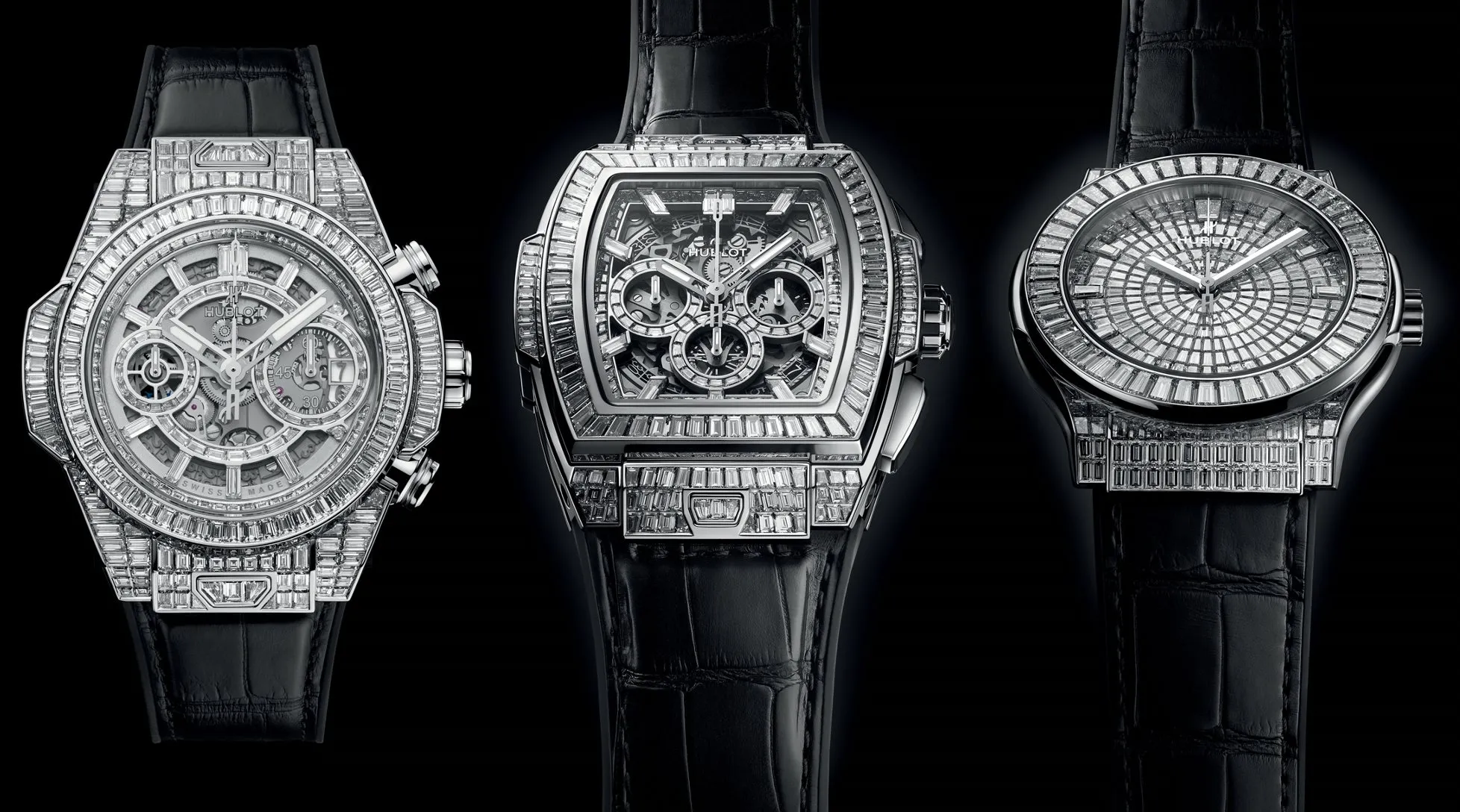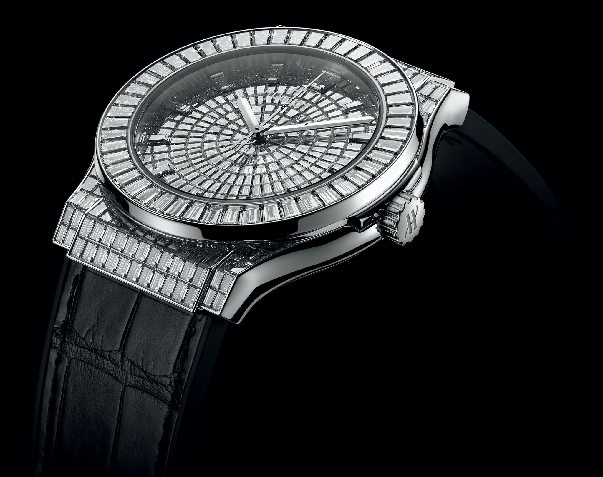 Posee 346 diamantes de talla baguette y 13,1 quilates, y está enfocado a los aficionados consideran el movimiento HUB4700 de Hublot. Su diseño se inspira directamente en el Big Bang, con un diseño de caja único que permite una infinita combinación de materiales. En su versión de alta joyería, 178 diamantes (8,1 quilates) engalanan la silueta de su caja en forma de tonel, con otros 113 (2,1 quilates) engastados en torno a los bordes de los índices y el disco de los minutos en las 3 h, el disco de las horas en las 6 h y el disco de los segundos a las 9 h. Completa esta pieza preciosa una elegante correa en piel de aligátor cosida en caucho natural con 55 diamantes de talla baguette (2,9 quilates) engastados en la hebilla.