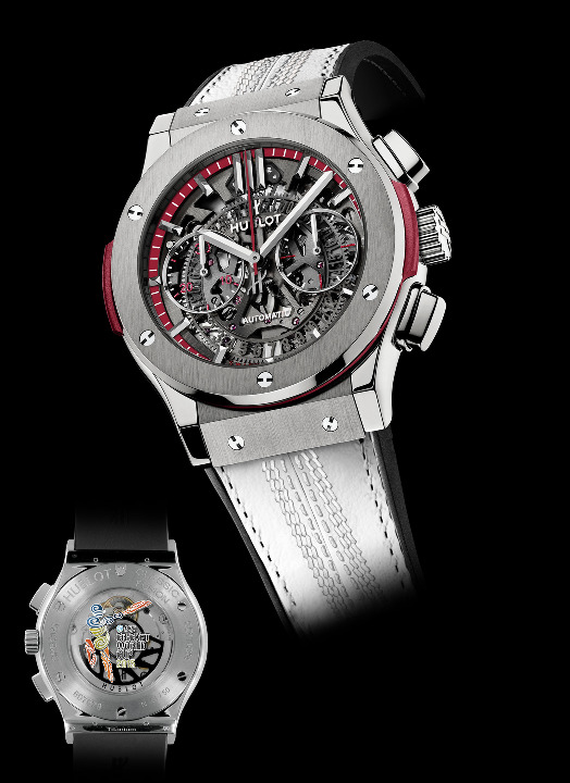 Este reloj de 45 mm de diámetro está disponible en dos versiones: una edición limitada en King Gold de 100 ejemplares numerados (oro de 18 quilates de Hublot con un 5% adicional de platino, que le aporta ese color rojo aún más intenso y lo hace por tanto más precioso) y una edición en titanio de 250 ejemplares numerados, ligera y más resistente a los golpes. Cada uno de los relojes se entrega con una segunda correa blanca que aporta un look más veraniego cuando el cliente se encuentra en el estado de ánimo propicio.