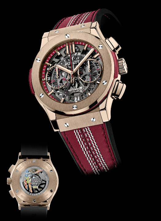 El Classic Fusion Chrono Aerofusion Cricket fue equipado con un movimiento de cronógrafo de cuerda automática HUB1155 calado para revelar su magnífica mecánica y con una ventanilla de fecha situada a las 6 h. El Classic Fusion Chrono Aerofusion Cricket incorpora en la carátula cuatro símbolos distintivos que hacen referencia directa al cricket: a las 12 h, un aplique triple en referencia al wicket, nombre que se da a uno de los dos juegos de tres postes de madera defendidos en el campo por el bateador, mientras que las agujas de ambos contadores tienen la forma de un bate de cricket, que evoca una pala corta hecha de sauce y mimbre. El fondo de caja presenta el símbolo exclusivo de la Copa del Mundo de Cricket 2015 del ICC a modo de calcado en el cristal de zafiro. El conjunto está rematado por una correa de piel de becerro roja cosida sobre caucho negro, con pespunte de guarnicionero triple en alusión a la pelota de cricket.