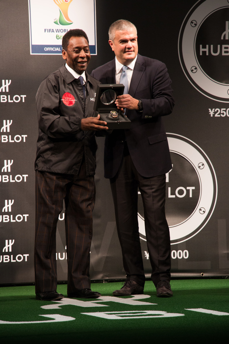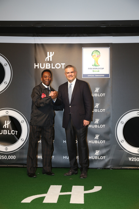 Pelé y Ricardo Guadalupe, CEO de Hublot, en la presentación del reloj oficial de la Copa del Mundo, Brasil 2014.