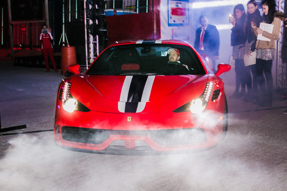 Si bien Vettel tenía que regresar a la concentración de su hotel para prepararse para el primer día de prácticas, concedió unas palabras a los asistentes en entrevista con Jacky, además de completar el HUBLOT Challenge, que consistía en nombrar la mayor cantidad de Ferrari protagonistas de las cintas de Hollywood más aclamadas por el mundo del deporte motor.