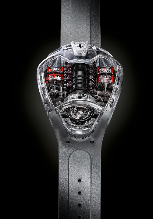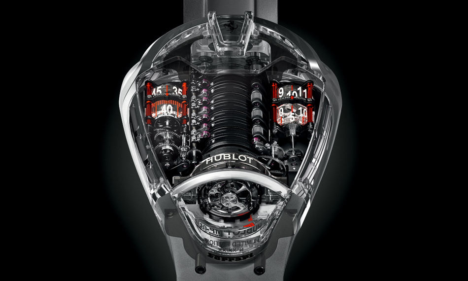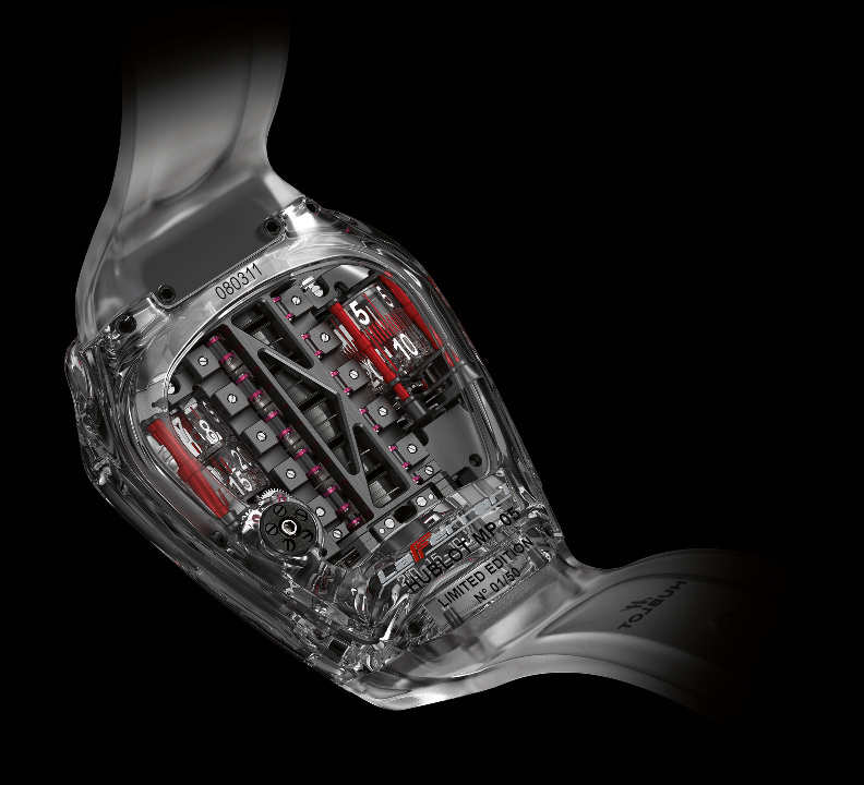 Finalmente la presentación del MP-05 LaFerrari Sapphire, un tribujo al FXX K, se lanzó la noche de ayer en todo su esplendor. El mecanismo que porta es un calibre de carga manual (a través de una herramienta especial), que remontúa 50 días de reserva de marcha gracias a 11 barriletes colocados en línea, cual si se tratara de un bloque de un automóvil Ferrari. Este récord de autonomía es posible gracias a una arquitectura desarrollada por la Manufactura de relojes, la cual decidió brindar total transparencia a la caja que, en este modelo fue desarrollada en cristal de zafiro a partir de un diseño 3D.