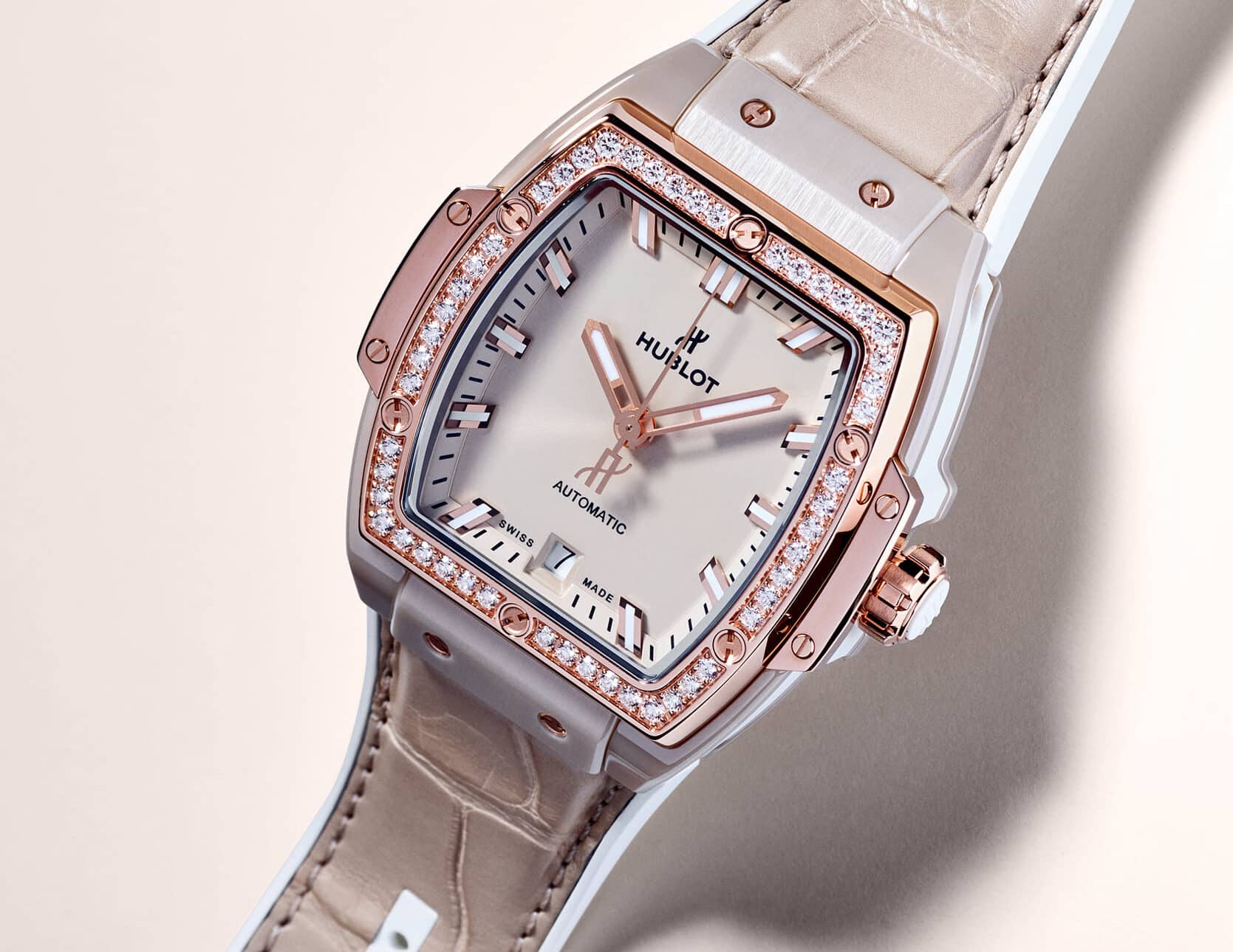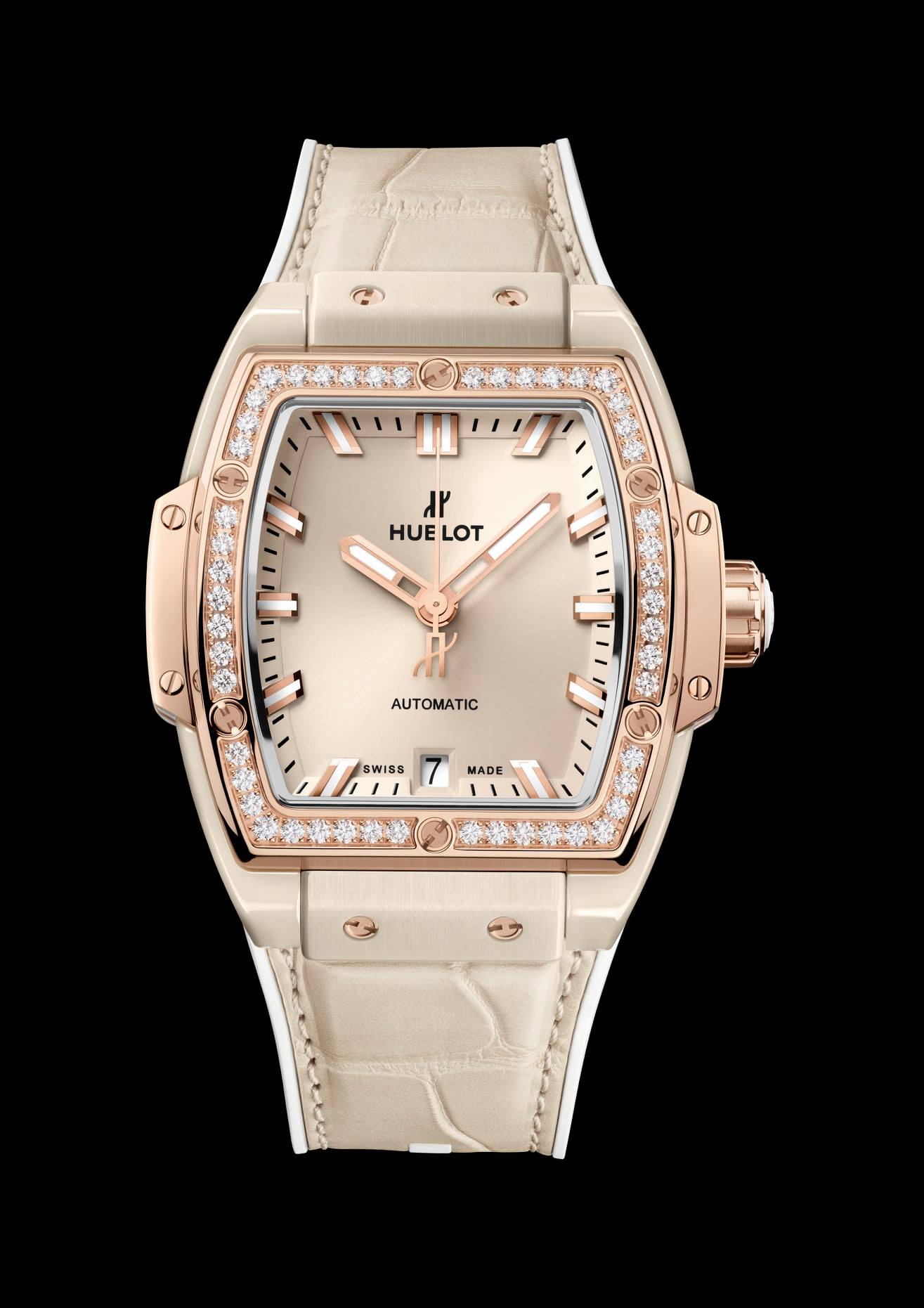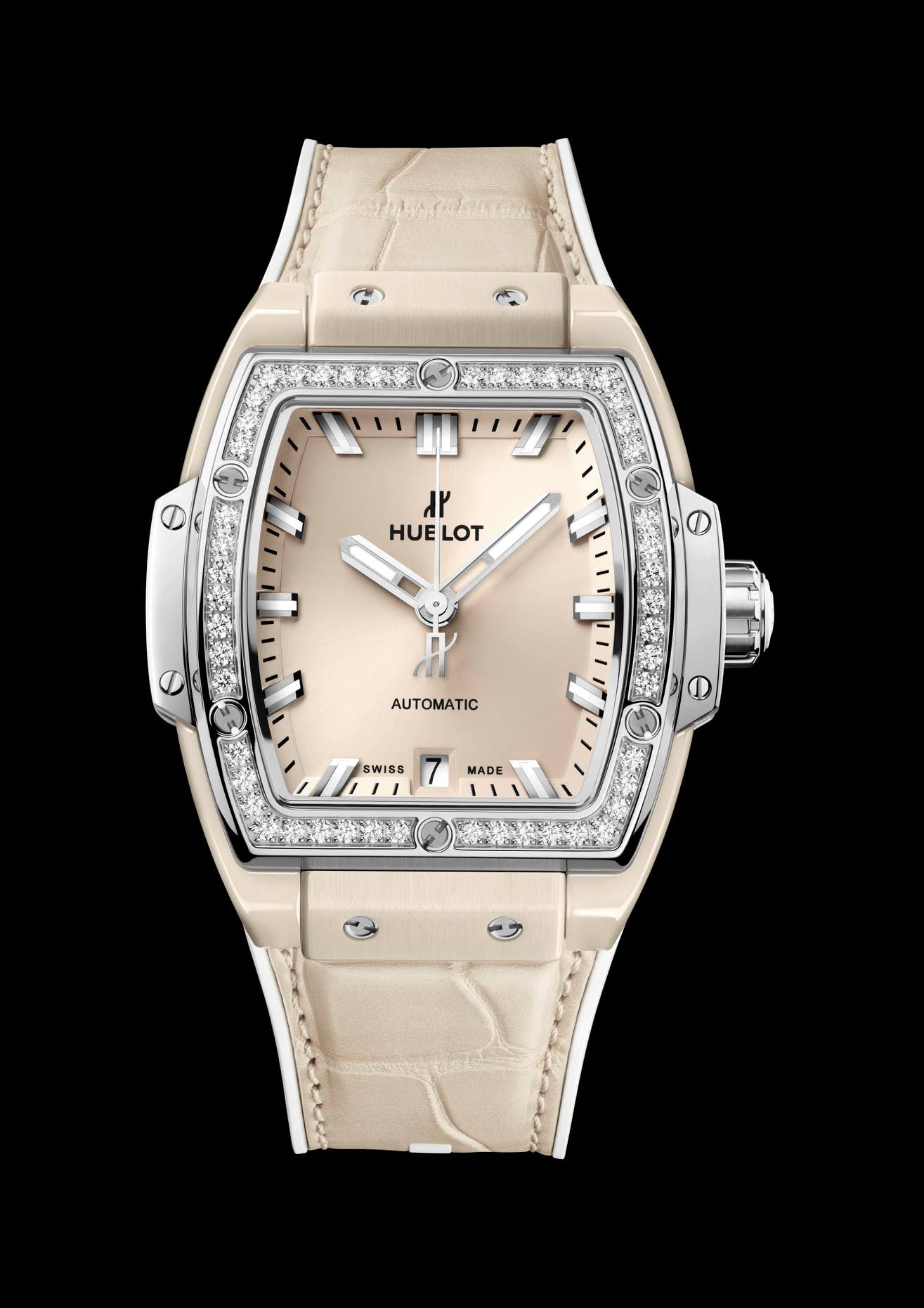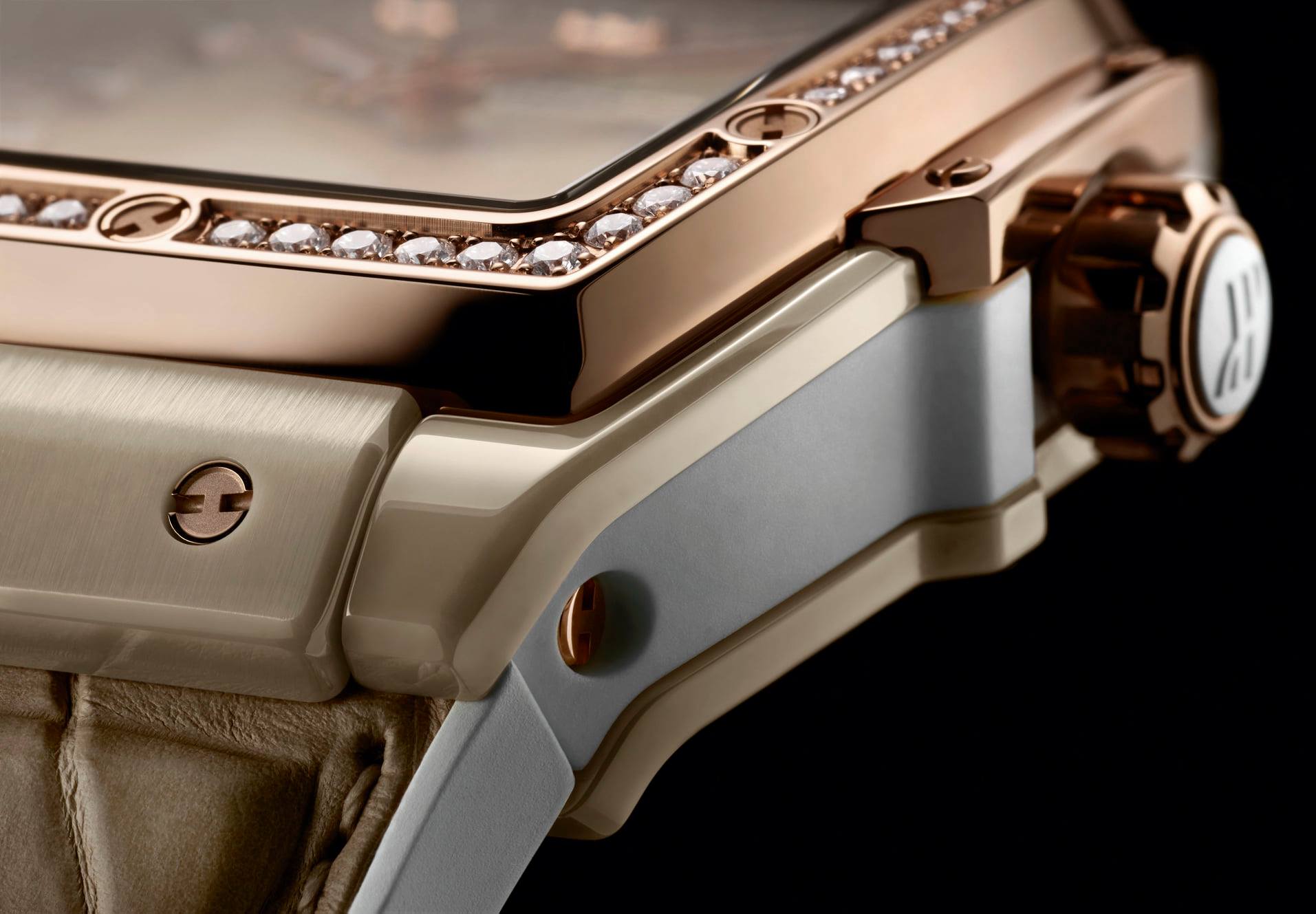 El Spirit of Big Bang Ceramic Beige juega con el layering (superposición) de su correa de piel de caimán en color crudo sobre caucho blanco y su luminosa carátula color arena. El bisel es fabricado en King Gold de 18 quilates o en titanio pulido, ambos engastados con 50 diamantes. Destacando su emblemática caja con forma de tonel, el color beige exhibe sus suaves tonos en una cerámica con tacto aterciopelado.