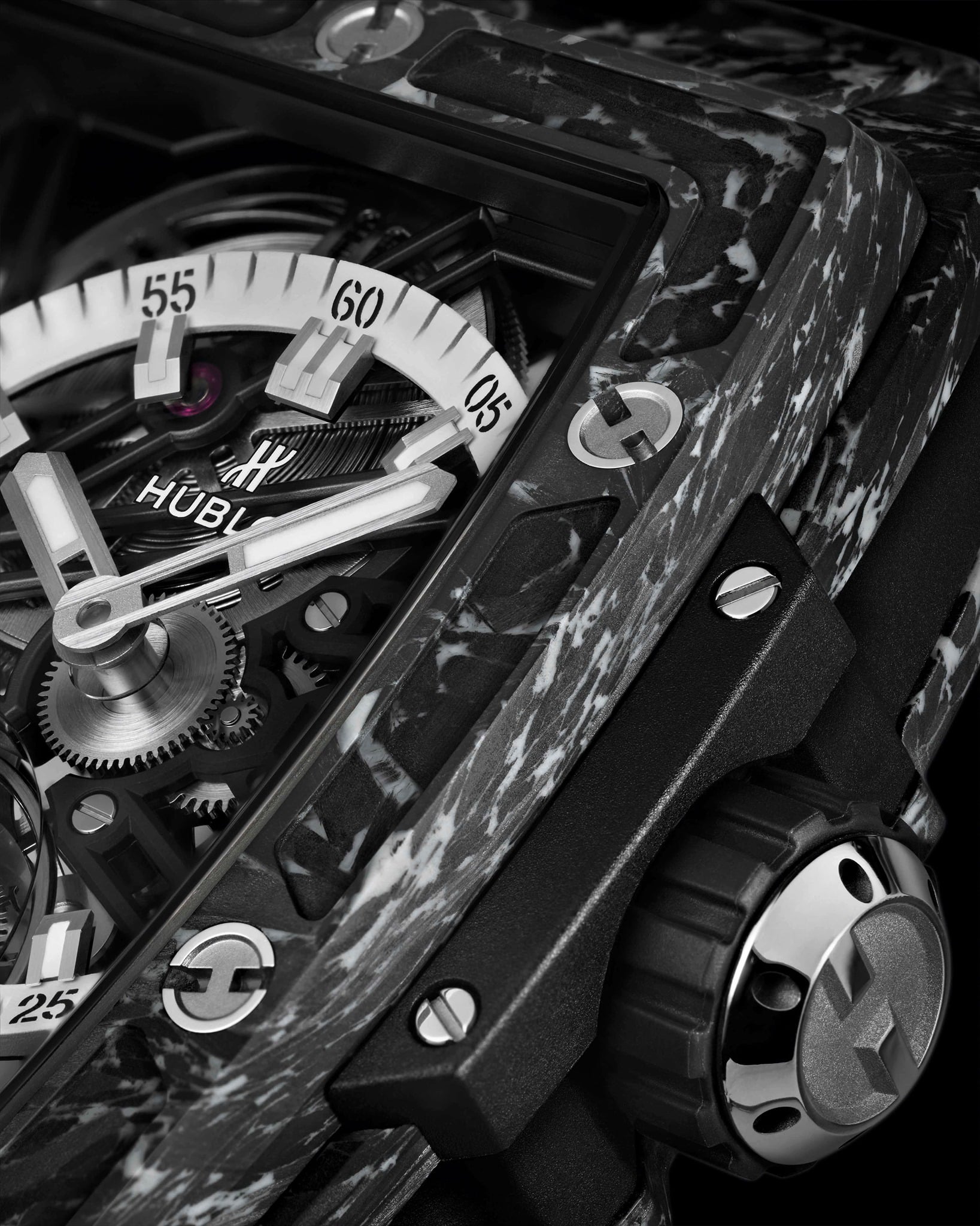 El Spirit of Big Bang Tourbillon White es diferente y, sin embargo, cien por cien Hublot. Este reloj concentra todos nuestros códigos distintivos: 6 tornillos de titanio en forma de H, construcción de la caja en sándwich, el Arte de la Fusión con la fibra de carbono e inclusiones de material compuesto, un movimiento de desarrollo interno tourbillon esqueletizado HUB6020 diseñado a medida para su caja tonel, un concentrado de innovación y saber hacer con una arquitectura de movimiento en la que se ha privilegiado la estética, como gusta en Hublot, y, por último, la intercambiabilidad de las pulseras gracias a su sistema patentado One Click. Ricardo Guadalupe.