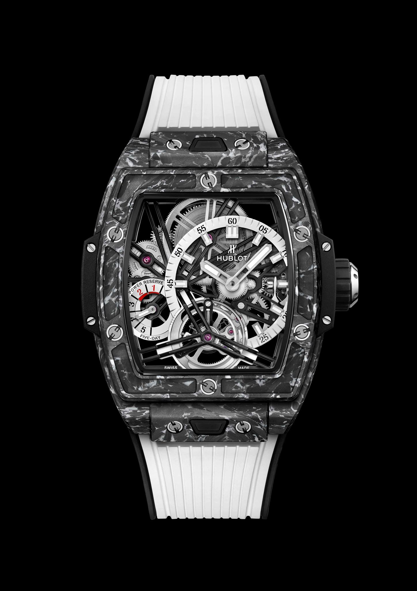 Con el Spirit of Big Bang Tourbillon 5-day Power Reserve Carbon White, Hublot logra integrar los opuestos, fusionando el negro y el blanco. La caja se extiende hasta los de 42 mm de diámetro y porta un bisel tallado en la fibra de carbono con incrustaciones de material compuesto blanco (microfibras de vidrio). A la rotura de los materiales compuestos; esta NWF, junto con las fibras de carbono, se impregna a continuación de resina epoxi teñida durante la elaboración de las preformas de los materiales compuestos en un molde especial.