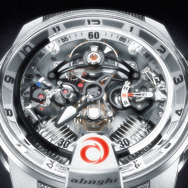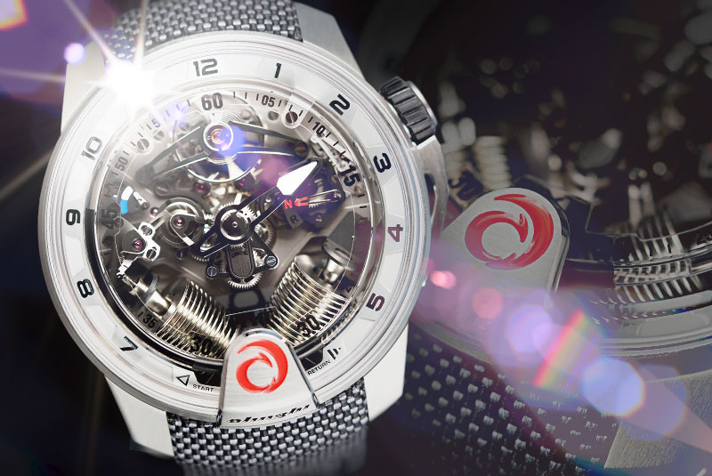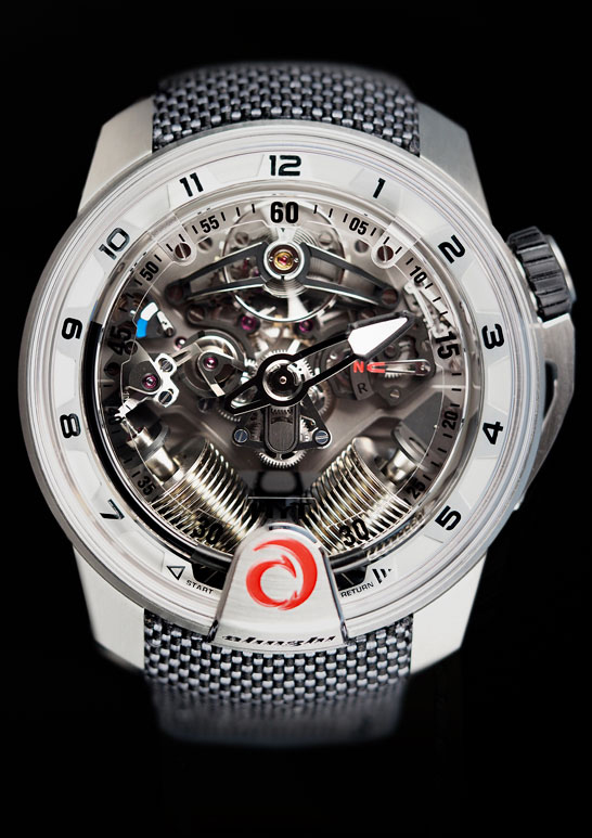 Finalmente, la pieza es animada por el calibre mecánico de remonte manual H2, que libera una reserva de marcha de 8 días a una frecuencia de 21,600 alternancias por hora. La indicación de las horas aparece por medio de un fluido-retrógrado patentado color negro, mientras la de los minutos se da por una aguja saltante. La pieza –de Edición Limitada a 25 ejemplares– se abraza a la muñeca mediante una correa de textil con hebilla desplegable.