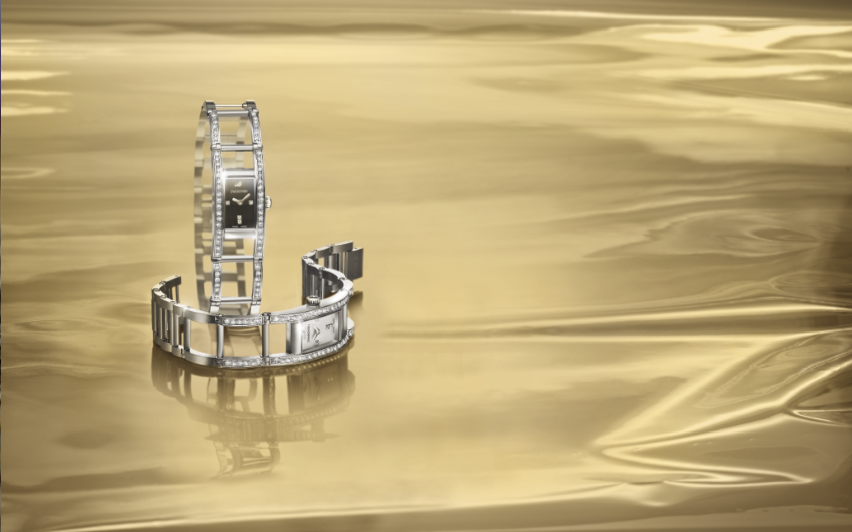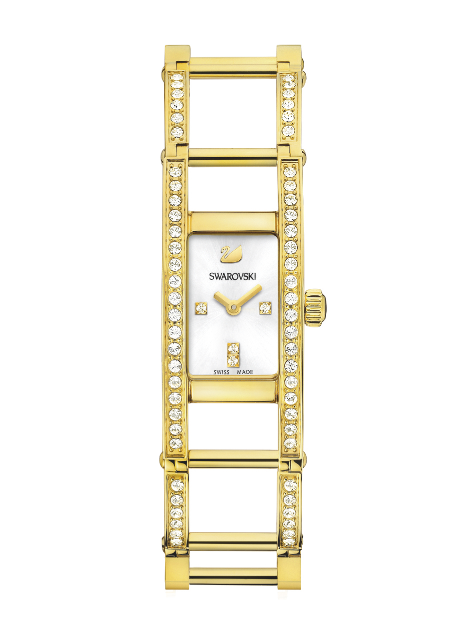 Caja: rectangular en acero inoxidable o acero inoxidable con revestimiento de PVD en oro amarillo con 36 cristales claros engastados.