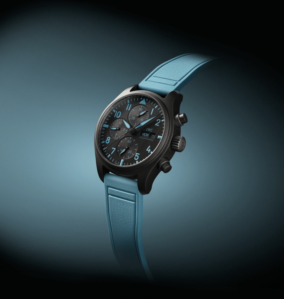 Sobre una base monocromática negra, este azul del IWC Pilot’s Watch Chronograph 41 y el IWC Pilot’s Watch Automatic 41 no busca estridencia, sino contraste funcional y una fuerte carga simbólica: calma bajo presión y agresividad controlada, dos cualidades esenciales en la élite del automovilismo. Ambos relojes están realizados en cerámica (óxido de circonio negro), un material que IWC domina desde los años ochenta por su ligereza y elevada resistencia a los arañazos.