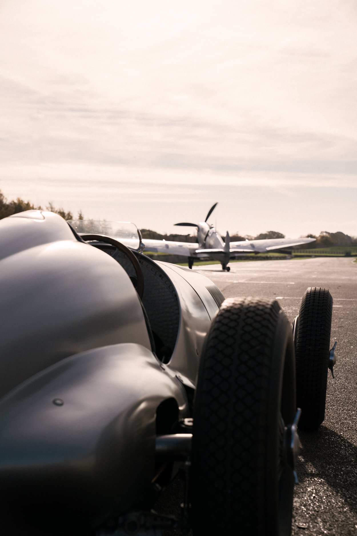 En la producción se observa a Hamilton a bordo de un Mercedes-Benz Silver Arrow W 125 por el circuito de Goodwood mientras que un Spitfire le da alcance.