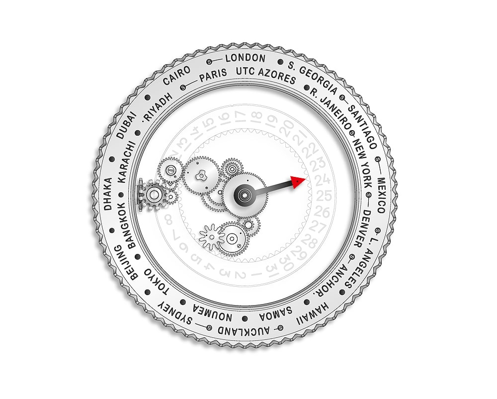 Porta un bisel de cerámica azul grabado con las 24 ciudades de sendos husos horarios mundiales, sí, sí está México incluido (horario CDMX). Destaca por incluir horarios de verano, como es el caso de la Ciudad de México, que cambia cada 6 meses para mostrar invierno o verano. Para ello se debe colocar la “S” (saving time) a las 12 horas.