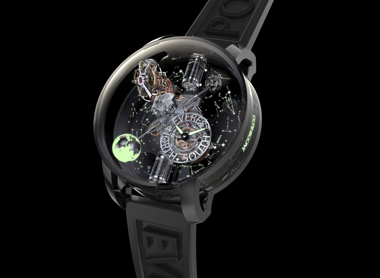 - Carátula: cuatro brazos satélites sosteniendo: carátula de tiempo esqueletada con el nombre Everest; tourbillon multi-axial de dos ejes a 60 seg y 5 min; diamante Jacob de 288 facetas; y globo terráqueo con tratamiento luminiscente; una piedra del Everest situada al centro del movimiento. Adicionalmente cuenta con dos recipientes cilíndricos que guardan agua del Polo Norte y Polo Sur, está contenida en dos cilindros transparentes colocados a las 12 y 6 h respectivamente, mientras que la bóveda celeste del hemisferio Norte y Sur lucen en la base del dial.