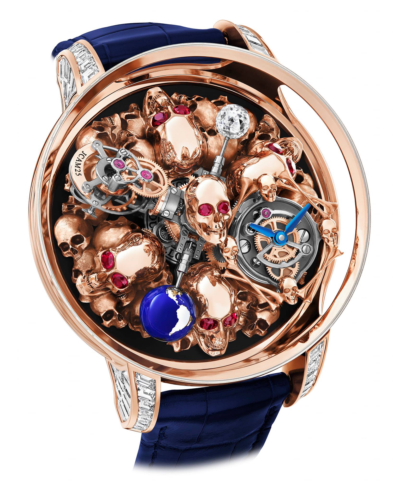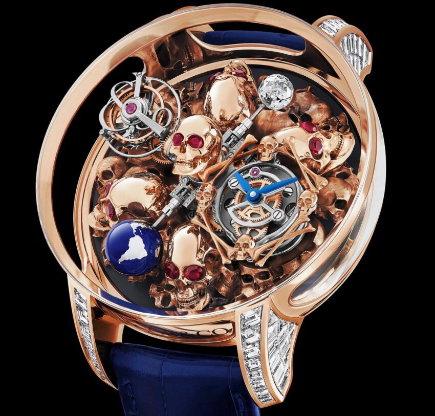 Astronomia Tourbillon Art Skulls representa la fusión y artesanía de la marca girando en torno a un culto por la fugacidad de la vida… la muerte. Memento mori ha sido desarrollado a partir de un trabajo artesanal extraordinario gracias a una carátula en forma de cripta de calaveras y huesos esculpidos en 45 gramos de oro rosa de 18 quilates. El trabajo ha tomado al menos 200 horas – seis meses a los orfebres, quienes destacan las calaveras con pequeños rubíes para los ojos.