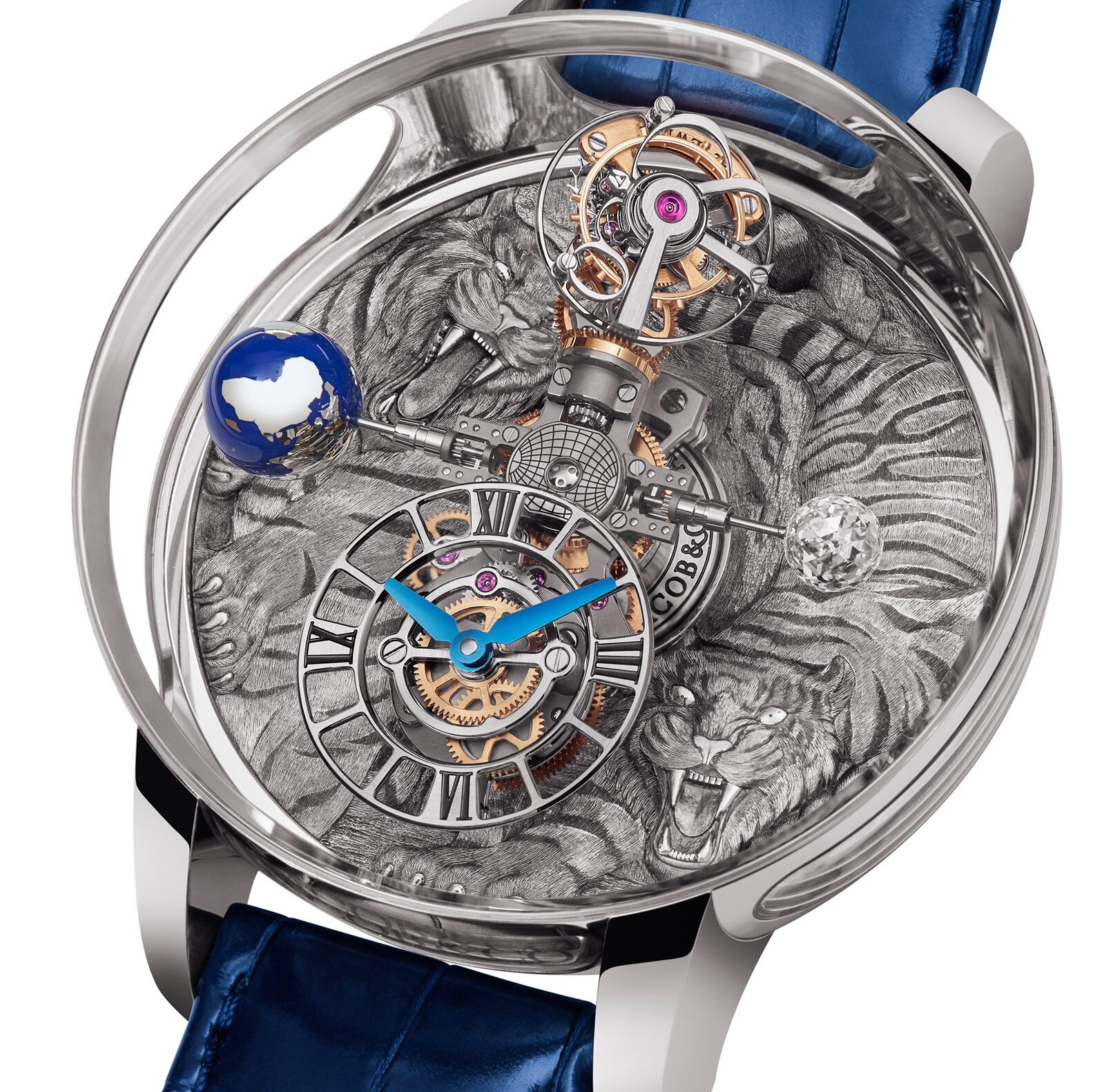 - Carátula: de oro blanco de 18 quilates grabada en 3D a mano con patrón de Tigres de Bengala; agujas de titanio pulidas y azuladas tipo Jacob & Co; índices lacados