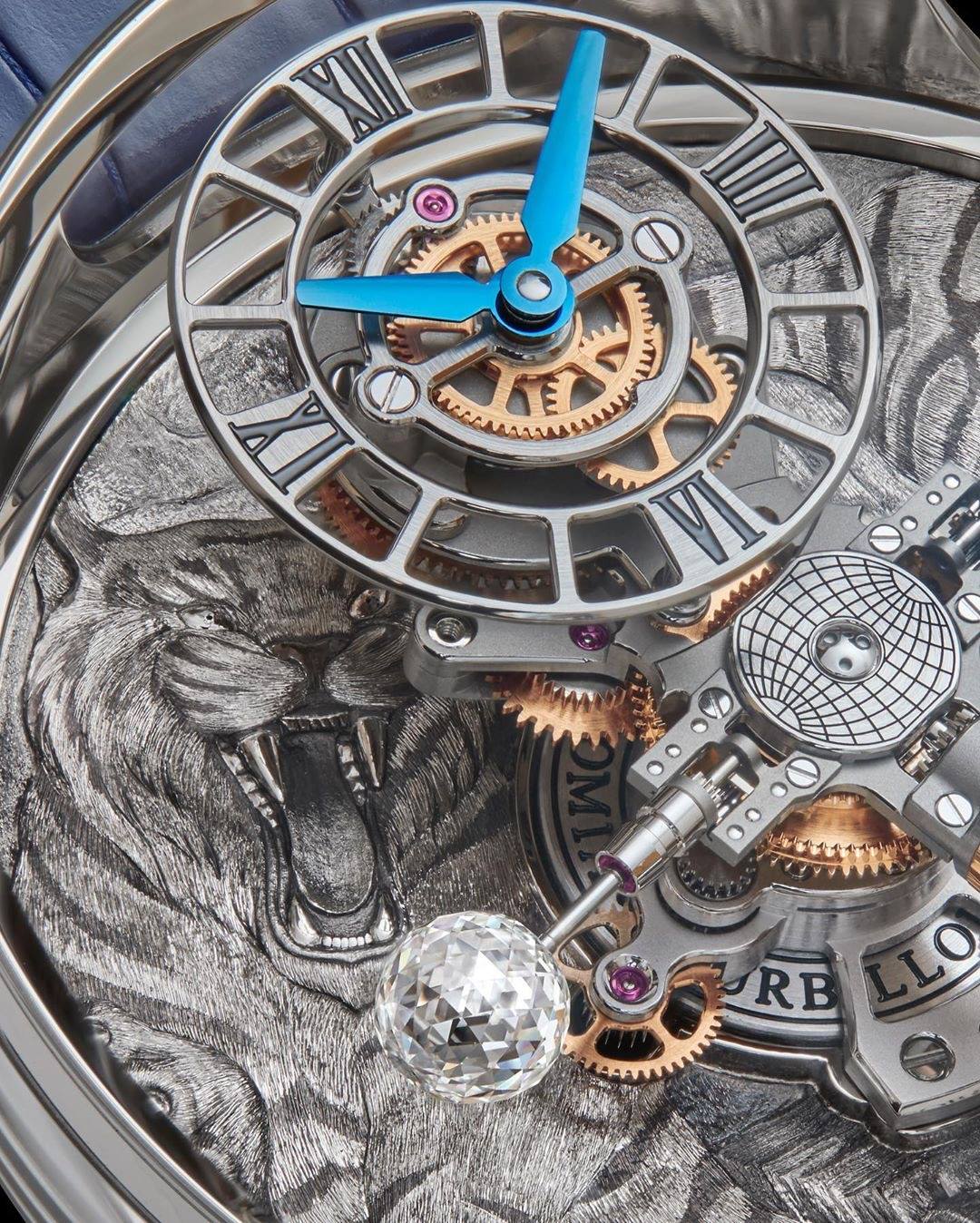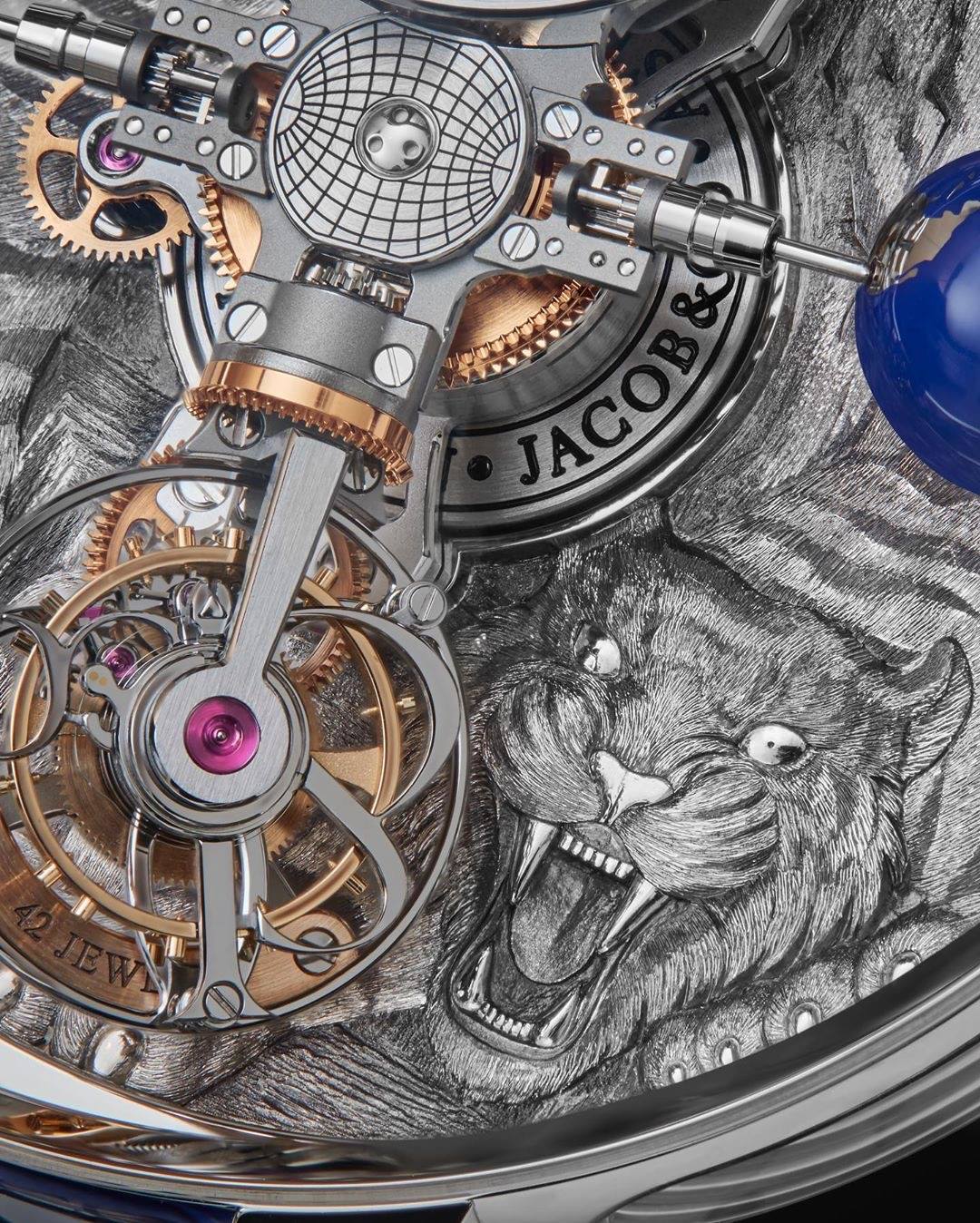 Jacob & Co Astronomia Tourbillon Art Tigers rinde homenaje al misticismo de uno de los animales, bestias, más hermosos que existe. El Tigre de Bengala o Tigre blanco funge como inspiración para desarrollar el más reciente Astronomia de la Casa con el agregado del grabado a mano.