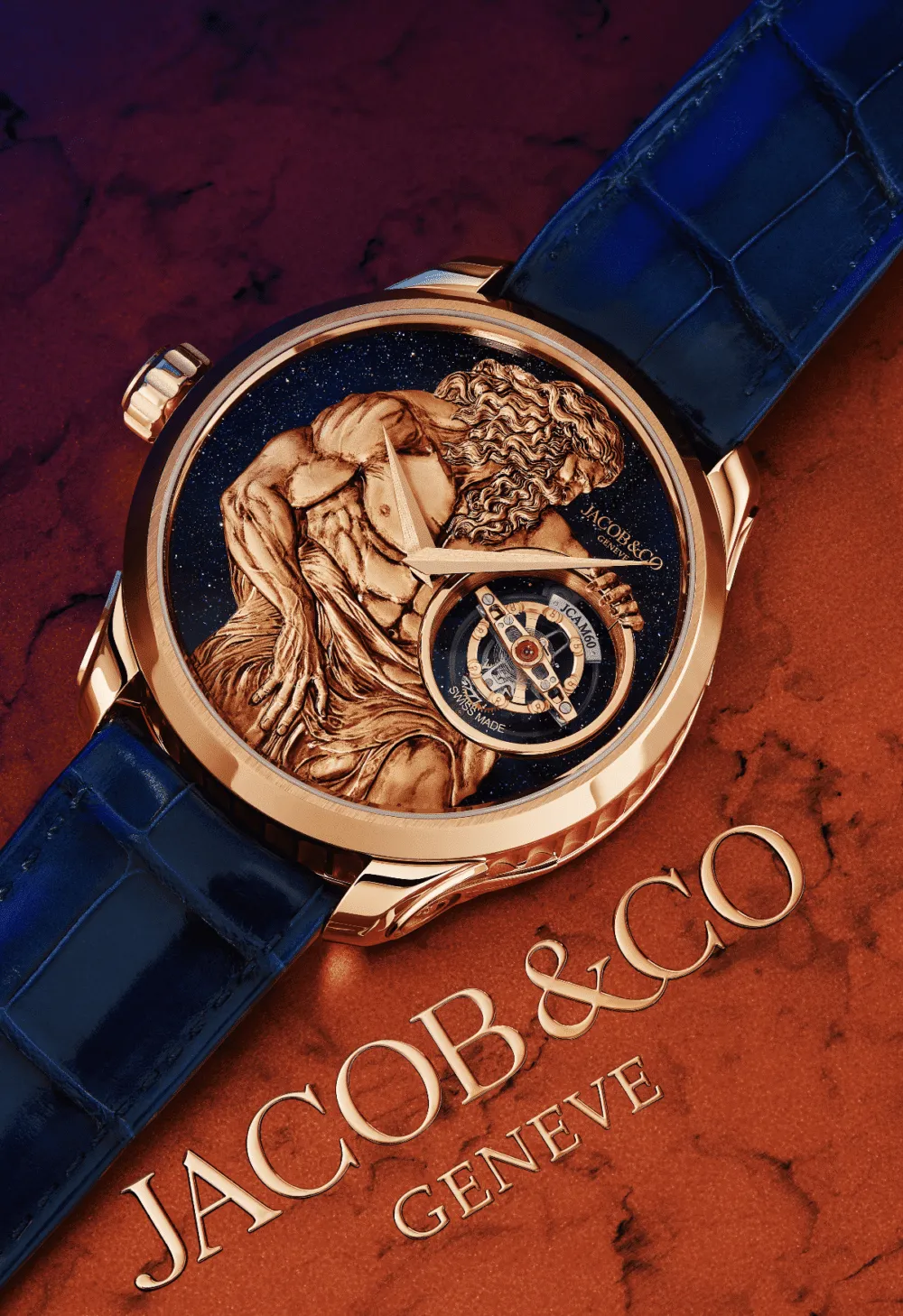 Jacob & Co. God of Time exhibe una representación del dios griego del tiempo, Chronos, en la carátula. Una verdadera escultura de oro en tres dimensiones, realizada completamente a mano con técnicas métiers d’art, con gran nivel de detalles realistas para una figura de 37 mm con cabello, barba, toga y músculos. Con el estilo impregnado de aura mitológica, la caja está diseñada como un pilar de estilo jónico, cuyo capitel está formado por dos amplias y elegantes volutas.