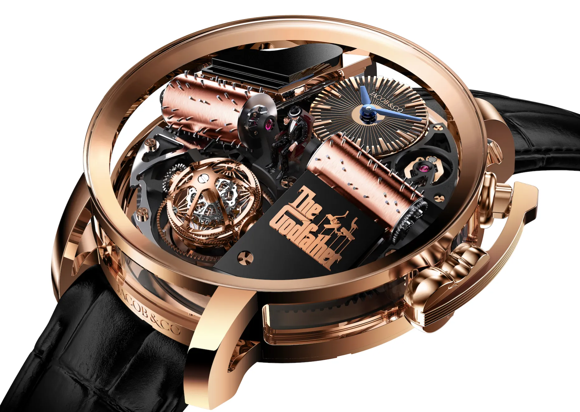 El reloj musical Opera God Father combina dos artesanías tradicionales suizas: una caja de música mecánica con dos cilindros y peines y un exclusivo calibre de cuerda manual, así lo definió Jacob & Co.