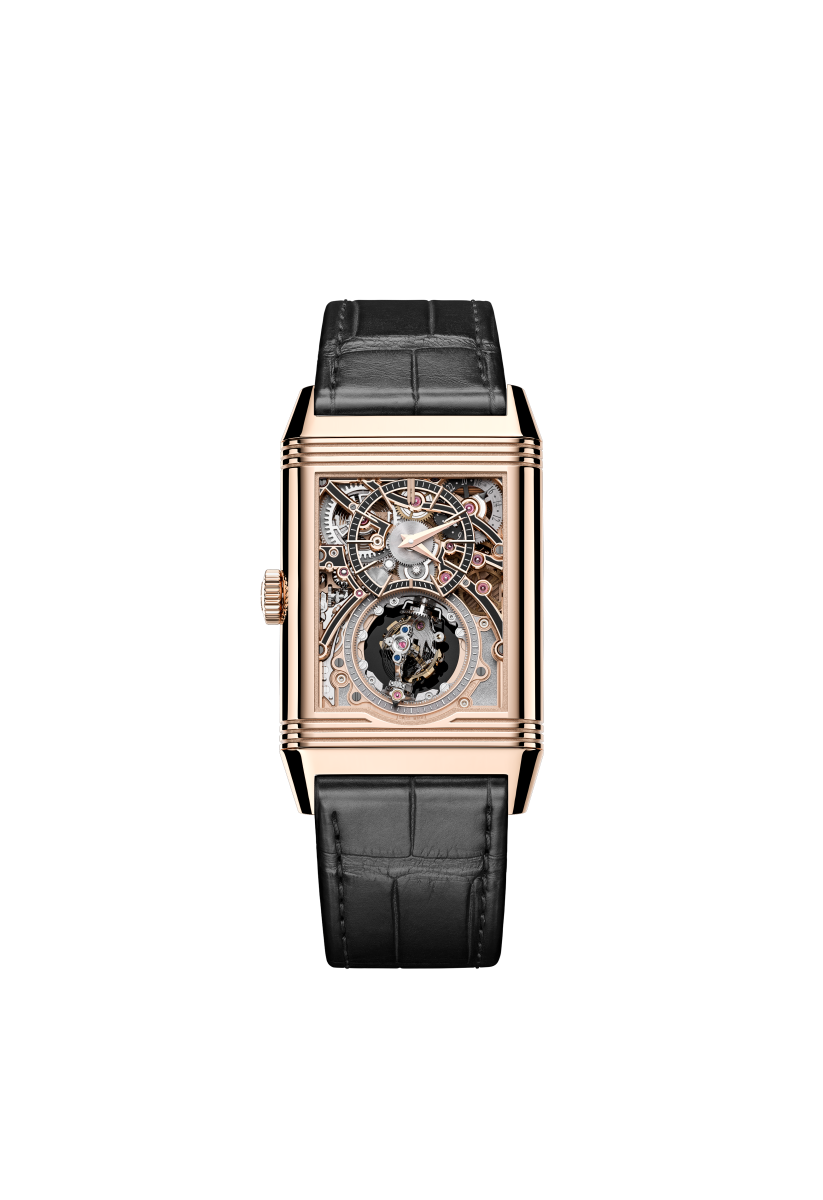 Además de incorporar el mecanismo Duoface, el Calibre 179 (manual con 382 componentes) presenta la cuarta evolución del Gyrotourbillon, el tourbillon multieje característico de la Manufactura desarrollado específicamente para el Reverso. Una jaula de titanio ultraligera y otra jaula periférica montada en rodamientos que giran en direcciones opuestas a diferentes velocidades: la jaula interior del tourbillon gira 360 grados cada 16 segundos y la jaula periférica efectúa una rotación una vez por minuto.