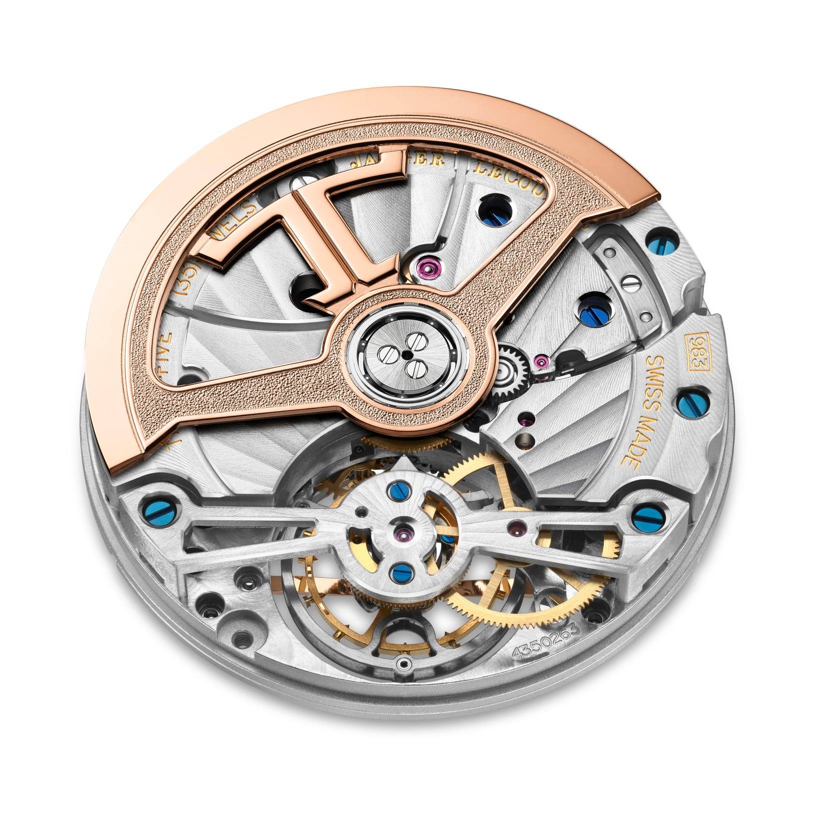 El rotor de cuerda esqueletado de oro rosa, que presenta el logotipo JL y una combinación de superficies pulidas y microgranalladas, permite una visualización clara del movimiento, e incluye unos refinados acabados adicionales, como los tornillos azules, el graneado circular y los puentes biselados.