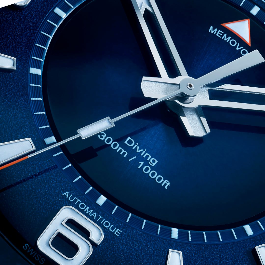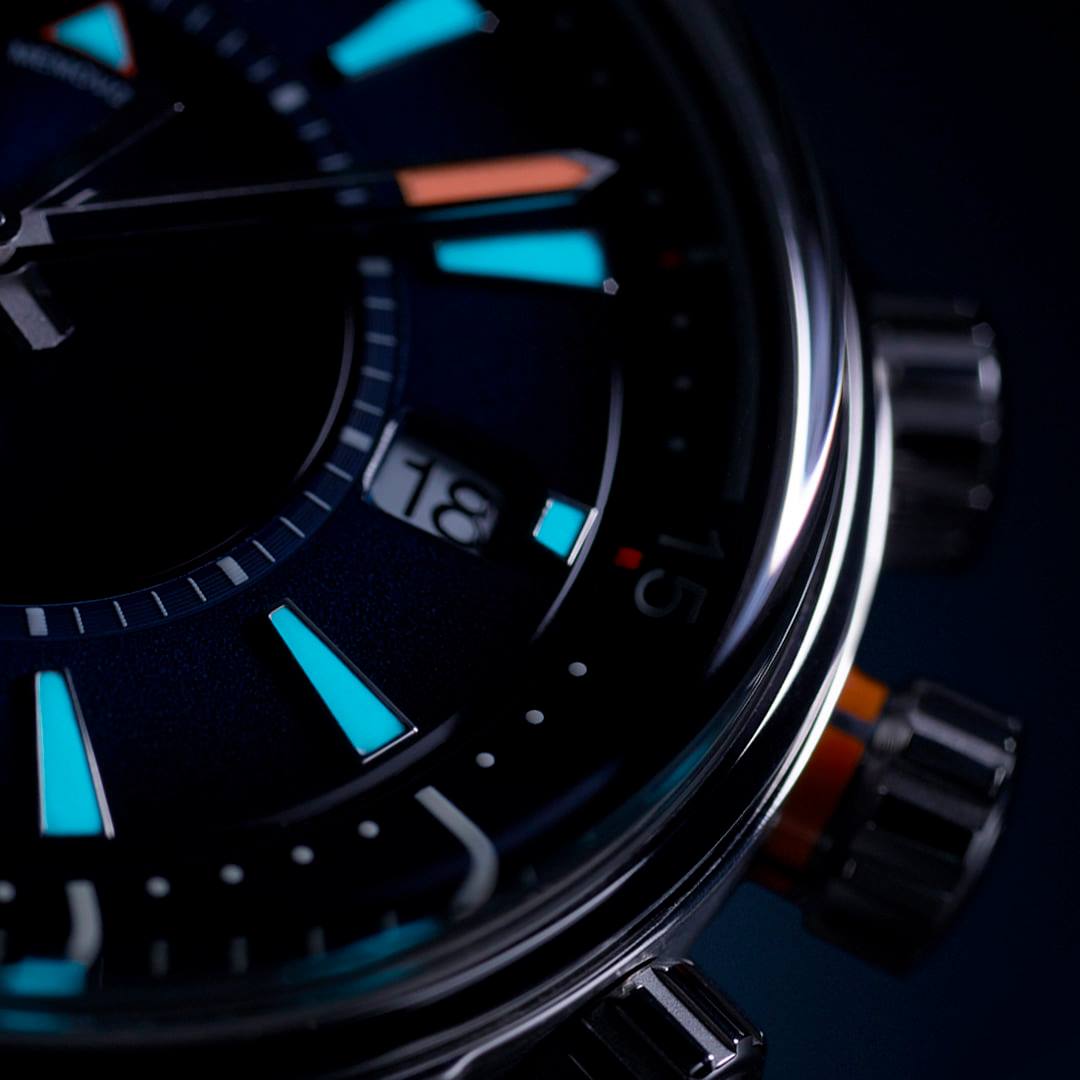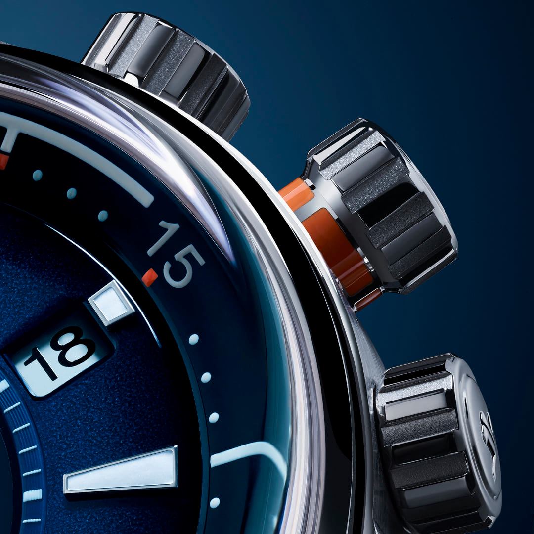 - Carátula: gradiente azul con acabados soleados, graneados y opalinos, vivos naranjas y 1-15 destacado en color blanco; Super-LumiNova en índices arábigos aplicados y agujas esqueletadas