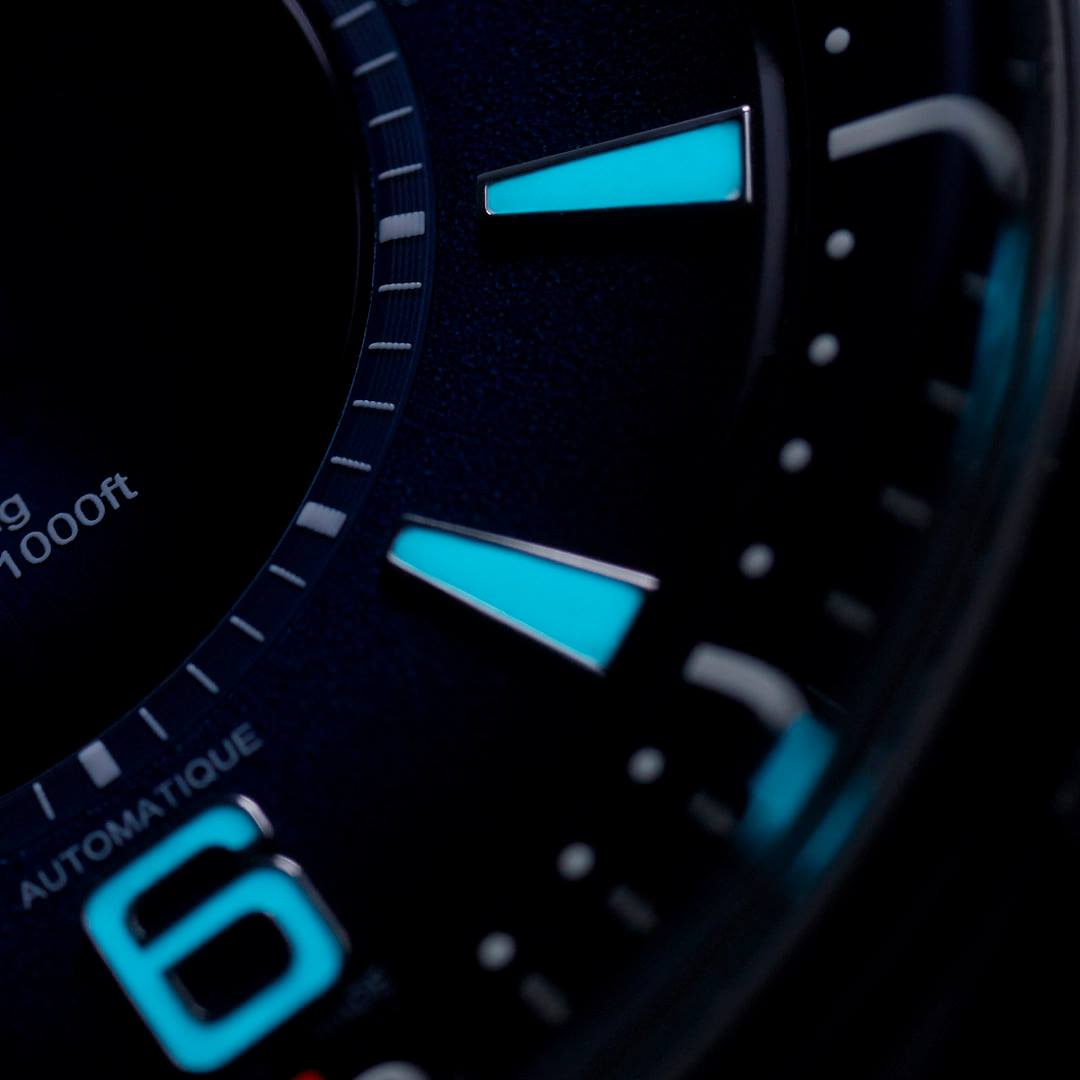 Desarrollado con un espíritu atemporal bien delineado, la nueva pieza reúne los códigos de deportividad y elegancia a partir de diferentes elementos en sus acabados. El granallado sobre el contorno realza la pista de las horas y de los minutos, mientras que un tratamiento opalino destaca el bisel interior giratorio. Además, números árabes asociados a índices aplicados y tratamientos Super-LumiNova® que ofrecen una legibilidad máxima, se conjuntan para dar un resultado magnífico.