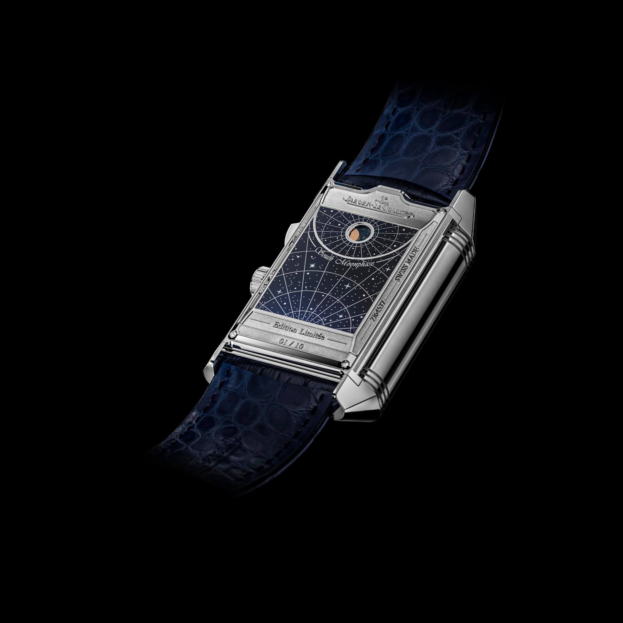 En la última cara del Quadriptyque, la cara exterior, se muestra una representación de las fases de la Luna en el Hemisferio Sur. La mayoría de las indicaciones de la fase lunar son de la perspectiva del hemisferio norte, y la visualización del Quadriptyque de la fase lunar del hemisferio sur en su cuarta cara es el cumplimiento del dualismo fundamental del Reverso. Un mapa del cielo salpicado de estrellas, grabado y lacado en un degradado de tonos azules forma el telón de fondo de la luna de oro rosa, todos los cuales se crean en el Atelier des Métiers Rares de Jaeger-LeCoultre.
