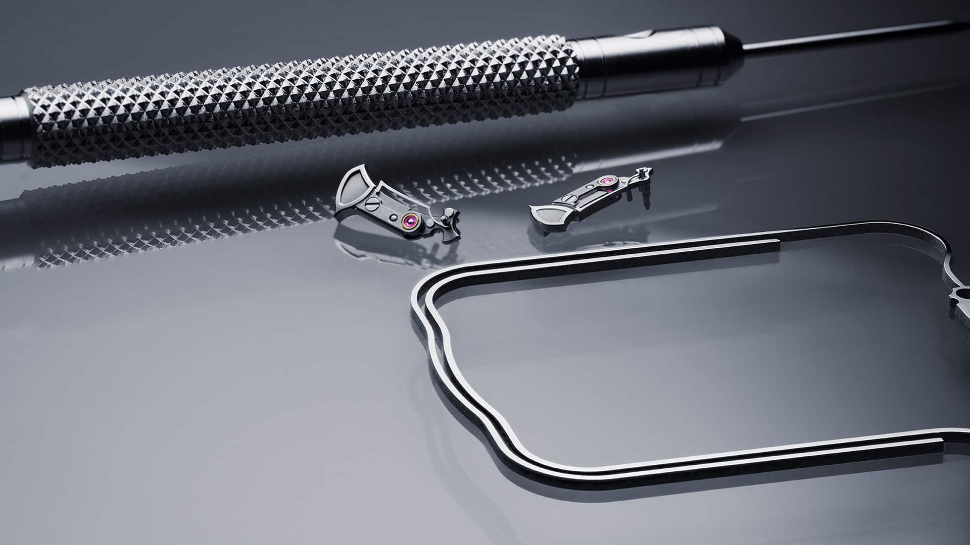 Se usa una corona de dos posiciones en el costado de la caja para establecer primero el número de días que han transcurrido desde que se usó el reloj por última vez. Con el Quadriptyque colocado dentro del marco de soporte de corrección, la corona correctora de caja se puede extender a su segunda posición y darle cuerda para llevar rápidamente el reloj a la fecha actual para todas las indicaciones astronómicas y del calendario. No hay riesgo de sobrecorregir el reloj o dañar el movimiento, ya que todo el proceso está controlado por el mecanismo corrector de caja.
