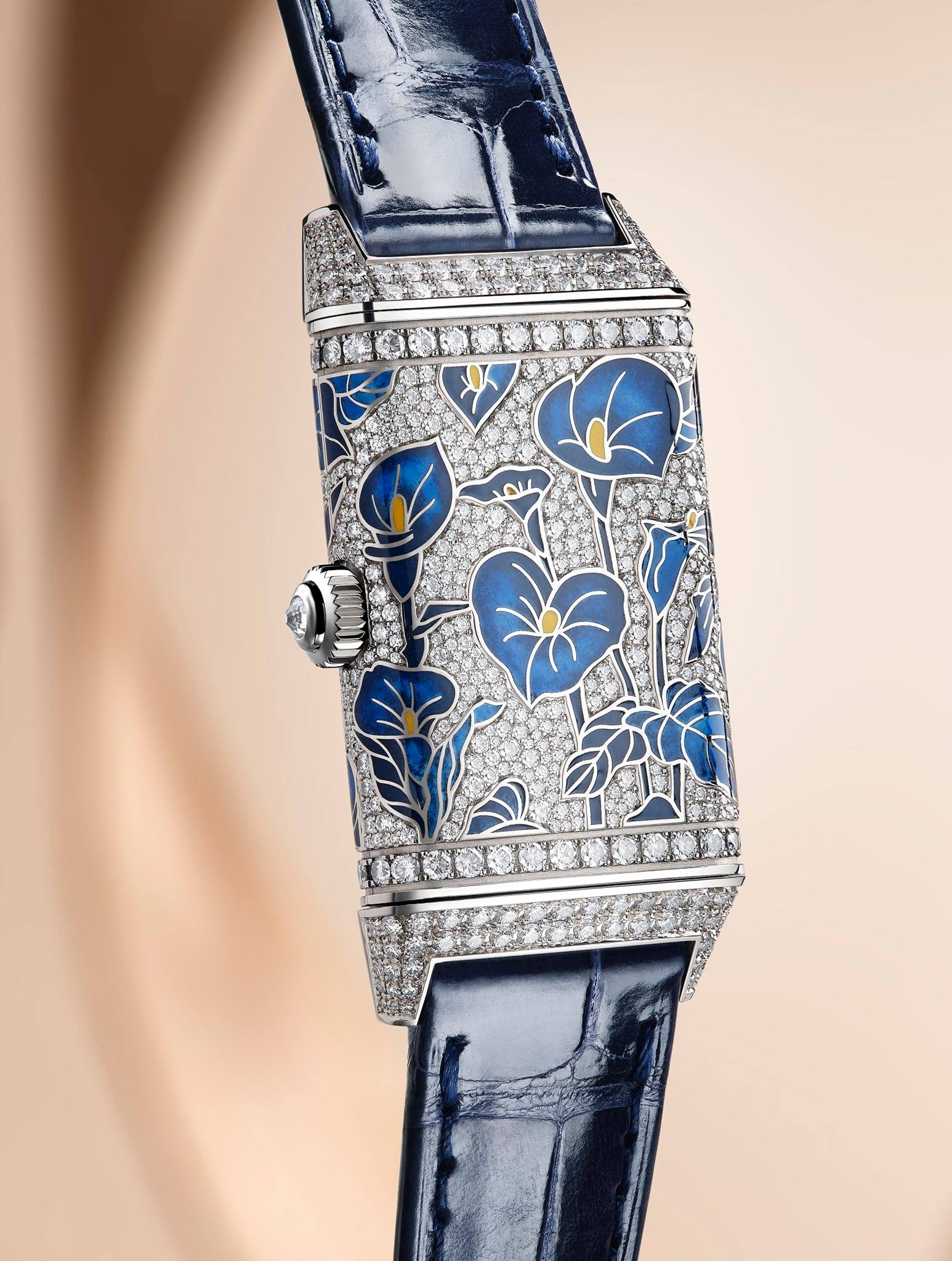 Dos modelos completamente engastados con diamantes también cuentan con calas: las calas púrpuras (de oro rosa) simbolizan el encanto y la pasión, y las calas azules (de oro blanco) la elegancia y el refinamiento. En estos dos relojes, las flores y las hojas están esmaltadas, y todo el fondo presenta diamantes con engaste “nieve”, una técnica exigente que requiere aproximadamente una hora para engastar solo cinco o seis piedras. En total, el engaste de estas piezas requiere 95 horas. El diseño floral envuelve a la perfección los laterales de la caja, desde el fondo hasta el bisel, con curvas y ángulos que añaden un alto grado de complejidad al trabajo de los artesanos.