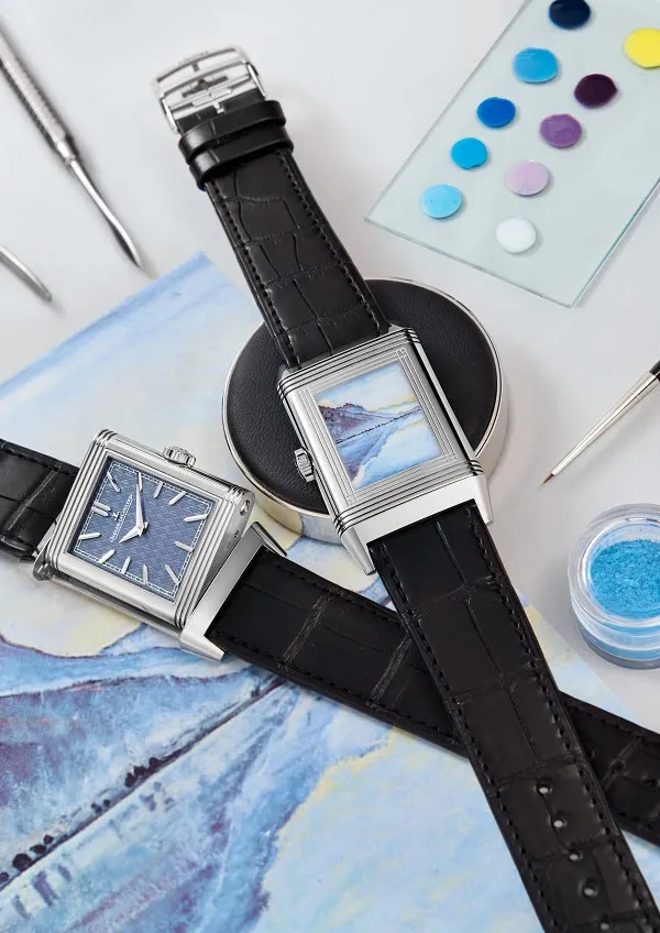 Para estas obras de arte, se eligió el Reverso Tribute Enamel, con su icónico estilo Art Deco. Se creó una caja de oro blanco especialmente para alojar la miniatura de esmalte. En el reverso, se puede ver una minuciosa pintura esmaltada de una obra con una técnica particular que rinde homenaje a tres estilos: puntillismo, pintura de lavado de tinta e impresión en bloque japonés.