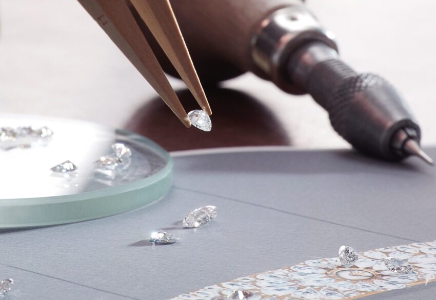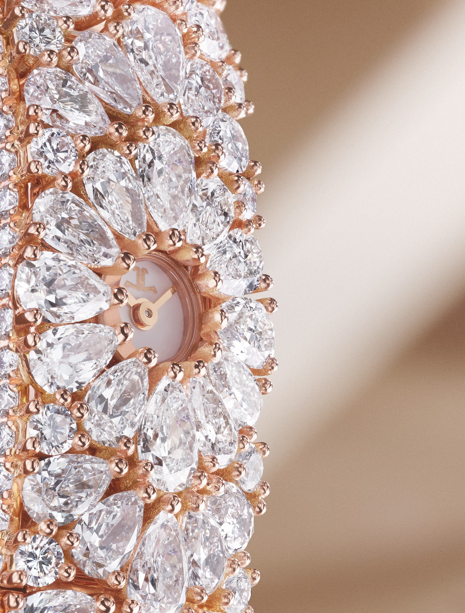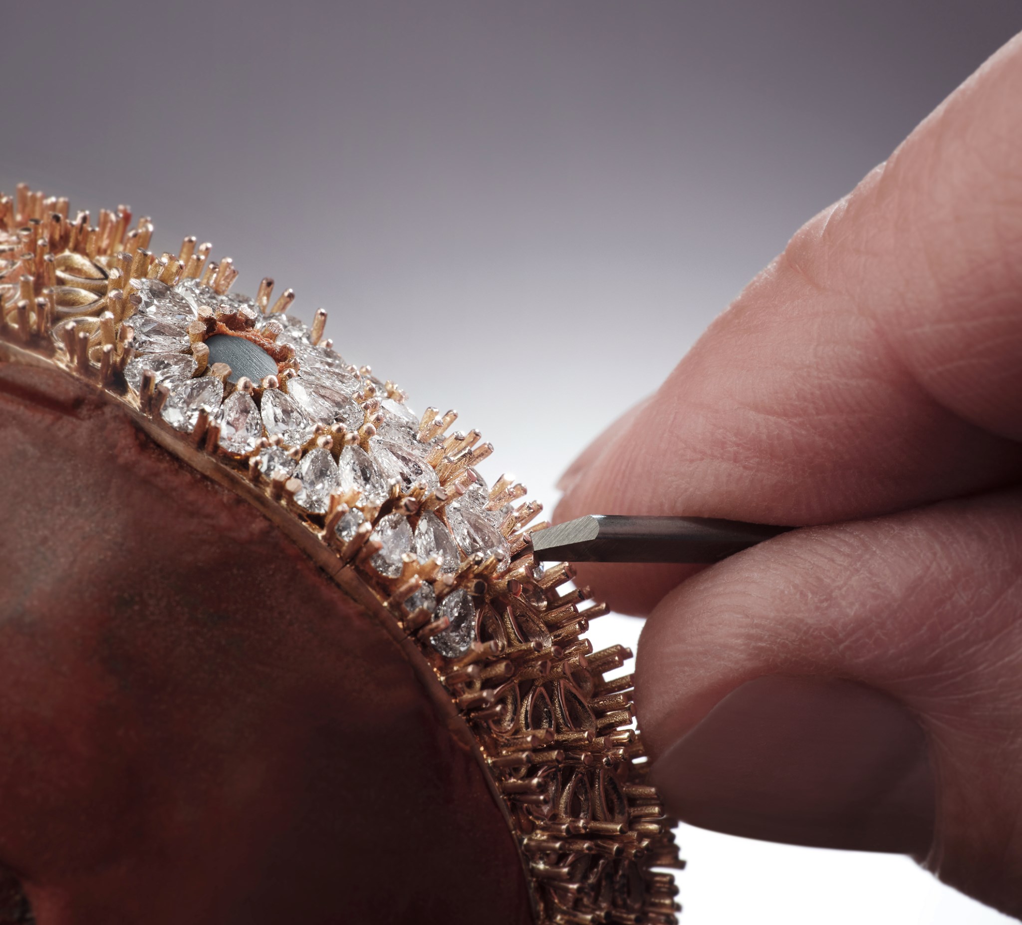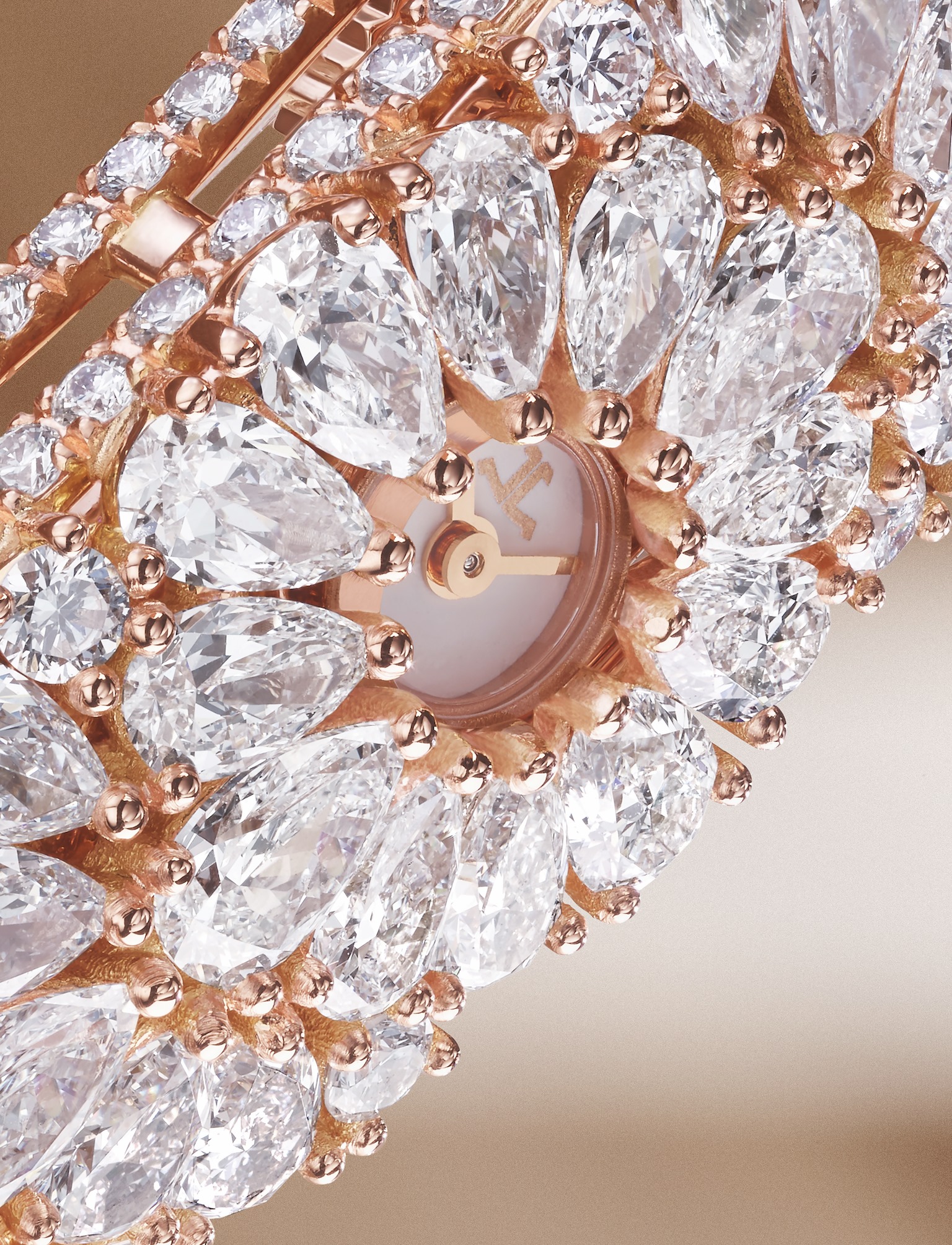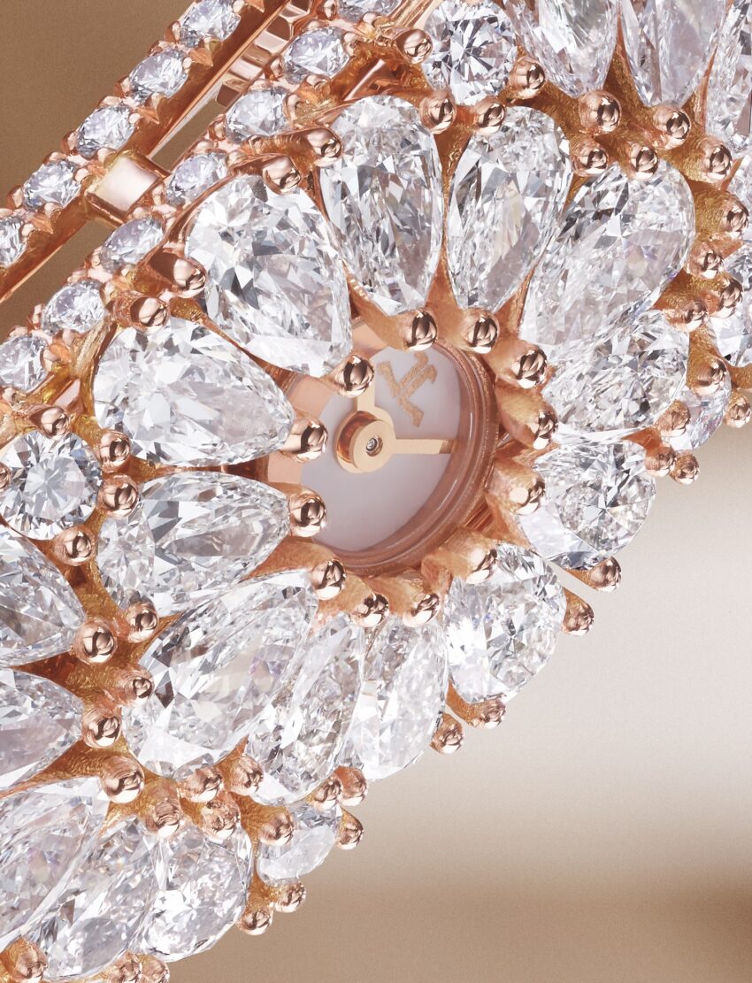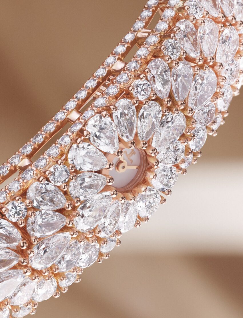 Con 904 diamantes, de los cuales 204 tienen forma de pera y el resto talla brillante (para un total de 20,9 quilates), el trabajo de engaste requiere 130 horas de trabajo de los artesanos de la joyería de la Grande Maison.