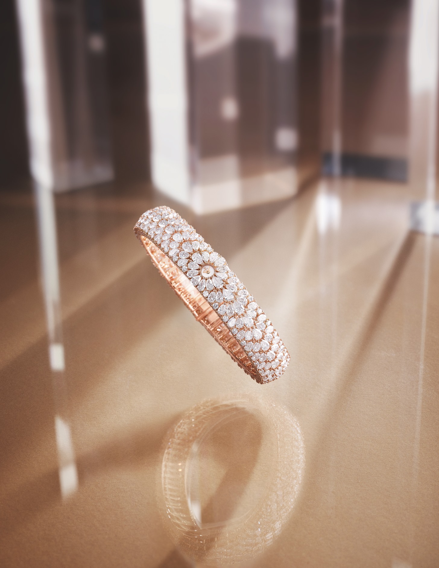Ambas pulseras se adhieren fielmente a los códigos clásicos de alta joyería y están fabricadas en oro rosa engastado con diamantes, utilizando sólo piedras clasificadas IF a VVS. Sin embargo, los diseños son completamente diferentes tanto en forma como en carácter, enfatizando la libertad creativa que permite el diminuto Calibre 101.