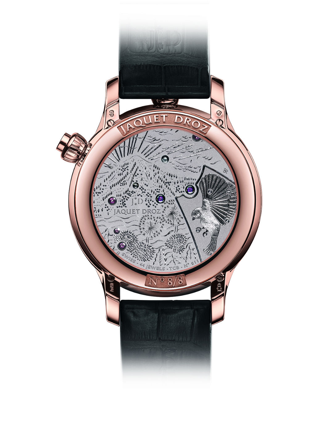 Dotado de un calibre 615 de remonte automático que carga por medio de un rotor de platino, un solo barrilete y un espiral de silicio, The Charming Bird ofrece a su portador no solo un instrumento para leer el tiempo, sino un aliado que encanta a la vista y al oído