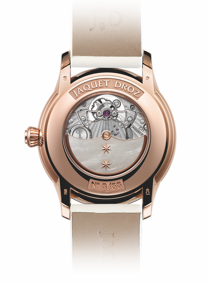 Este modelo alberga en su interior el espíritu del Siglo de las Luces que inspiró a Pierre Jaquet Droz durante la creación de piezas de Alta Relojería excepcionales. La belleza y la delicadeza de este reloj, simplifica la pasión con la que la marca de las dos estrellas desarrolla los mecanismos más complejos.
