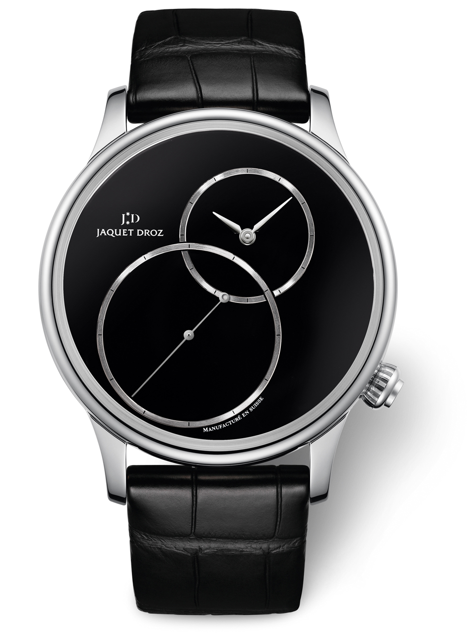 Dejándonos de nacionalismos, Jaquet Droz aprecia las propiedades de este elemento, y le propone en la carátula de su colección Grande Seconde, en la que las horas y minutos aparecen descentradas a las 2 h, y los segundos cobran fuerza en punto de las 7 horas.