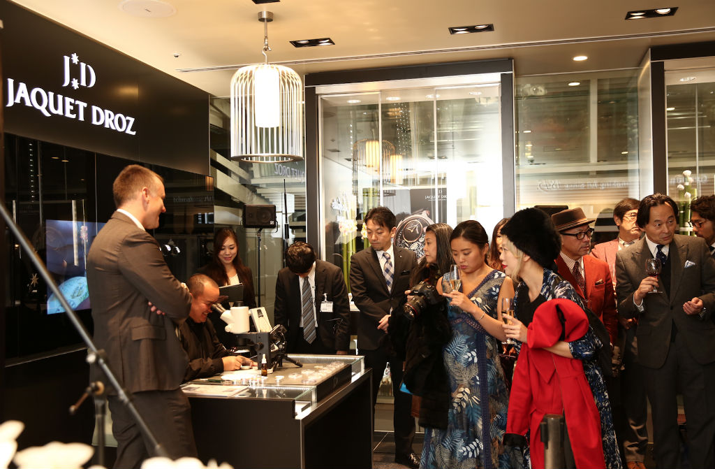 Ubicada en el Nicolas G. Hayek Center en Tokio, la renovada tienda invito a clientes y periodistas VIP a vivir una de las experiencias más exclusivas en compañía de Marc Aellen, Vicepresidente & Jefe Internacional de Ventas de Jaquet Droz y de Christophe Savioz, Presidente y Director delegado del Grupo Swatch en Japón. Durante las veladas celebradas el 10 y 11 de noviembre, Jaquet Droz cautivó a sus invitados con la presentación de uno de sus artistas de sus Ateliers d´Art, quien puso al descubierto la delicadeza de la pintura en miniatura sobre una carátula.