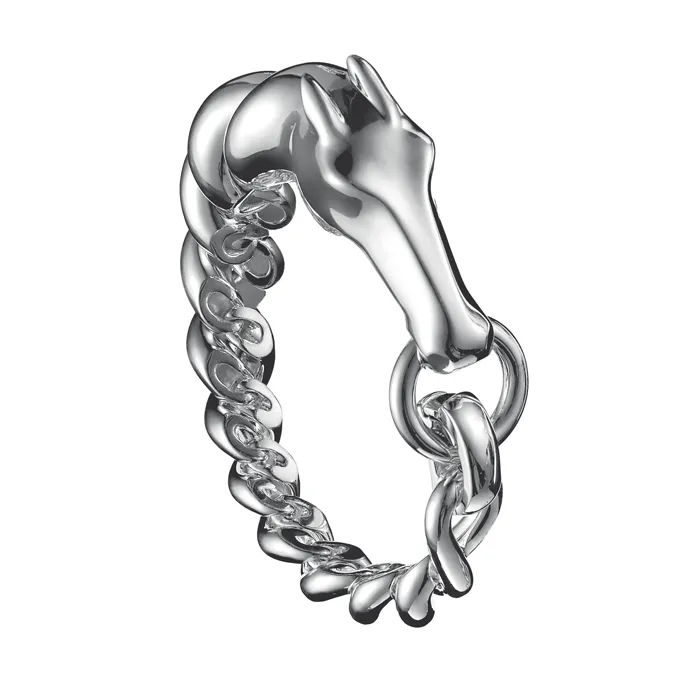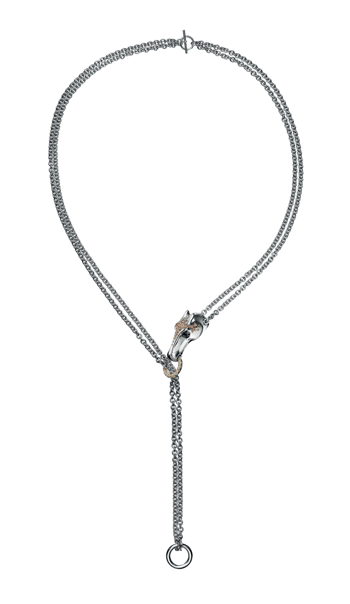 - El caballo, símbolo de la Casa, se convierte en una joya preciosa a través de este collar largo en plata y diamantes marrones; el anillo en plata y el brazalete trenzado reafirman la belleza de este animal.