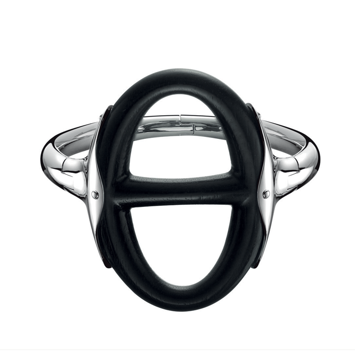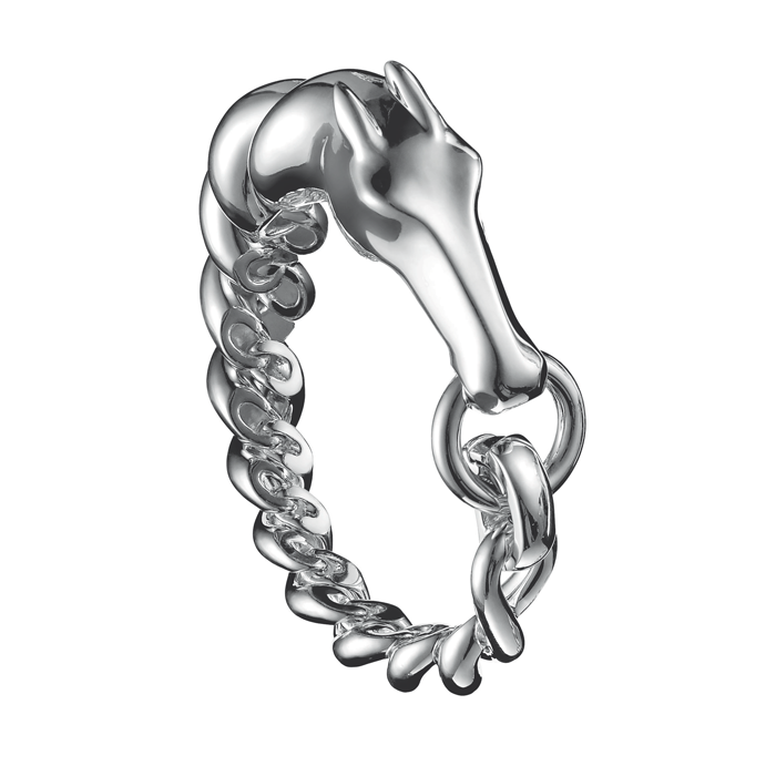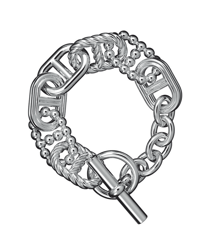 - El famoso brazalete Chaîne d’ancre initiale creado por Robert Dumas en 1938 aumenta su tamaño y se convierte en una escultura de plata. En la parte superior, donde lo horizontal y lo vertical convergen se puede apreciar ya sea una herradura o el símbolo naútico. Esta metamorphosis es aún más notoria cuando el oro rosa satinado contrasta con el brillo de la plata.