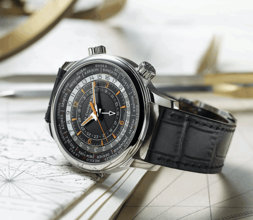 Funciona mediante capas concéntricas. En el centro de su esfera, una discreta aguja marca la fecha. En una segunda fila, una vía férrea permite leer las horas y los minutos del huso horario local por medio de las agujas dauphine, típicas de los relojes de la colección L.U.C. Se ajustan mediante la corona situada a las 2 horas. En tercera fila, un gran anillo graduado con 24 horas funciona en coordinación con el disco que lleva marcadas las ciudades de referencia de los 24 principales husos horarios. Al interior late un motor fabricado en la Manufactura de Chopard en Fleurier, el calibre 01.05-L con remonte automático y dos barriletes para 60 horas de autonomía a 4 Hz. Dicho poder da energía para la indicación de: horas, minutos, segundos, fecha al centro, visualización de las ciudades en el disco exterior del dial y del GMT a partir de un disco. La corona está posicionada a las 2 h para el ajuste de fecha, hora y huso horario, mientras que a las 4 h se realiza el ajuste de las ciudades. Se abraza al pulso mediante una correa de cocodrilo forrada con hebilla a juego.