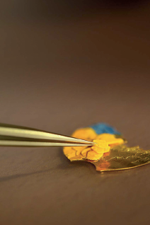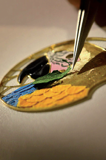 El mágico proceso detrás de esta creación incluye desde la elección de los pétalos de flores y su coloración, el corte de cada pétalo, hasta el fijado en una fina placa de madera, mediante una sierra de marquetería. Transformados de este modo, los pétalos se convierten en plumas, materia preciosa, noble y viva, sensual y frágil, cuyo volumen y textura contrastan con el resplandor del ónix y la esmeralda del pico y del ojo. Para rodear el ojo de plumas grises y negras, se realizan una por una manchas en pintura miniatura. Marquetería o engaste, varias decenas de horas son necesarias para que la carátula de esta creación vea la luz en el seno de la Manufactura y nos deje con la boca abierta.