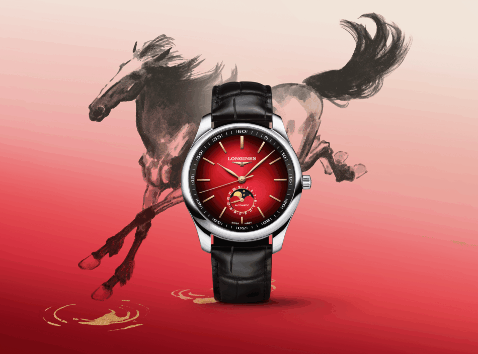 Una caja de acero inoxidable de 42 mm que resguarda una carátula soleada con un degradado que va del negro en el perímetro hasta el rojo en el centro encarnan el Longines Master Collection Year Of The Horse. La interpretación de la firma de Saint-Immier muestra horas minutos y segundos, así como las fases de la Luna. El calibre L899.5, exclusivo de Longines, se puede apreciar a través del fondo abierto de la caja, con su masa oscilante que lleva grabada un corcel galopando, obra del artista chino Peon Xu’s, y un pequeñísimo símbolo chino. En el perímetro se aprecia la leyenda “YEAR OF THE HORSE – LIMITED EDITION – ONE OF 2026”.