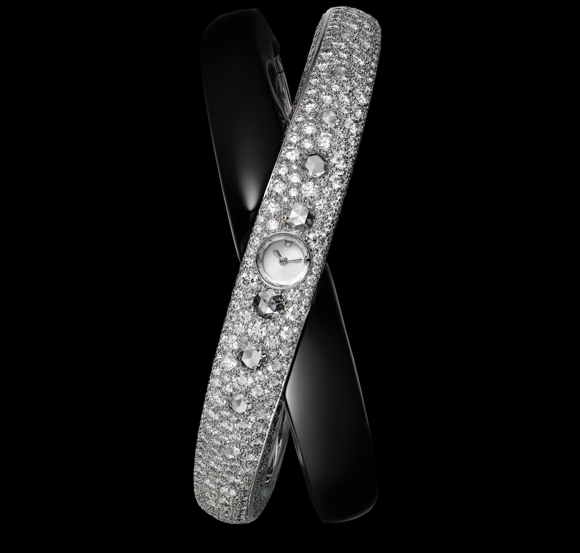 La pieza representa al cómplice perfecto para todas las audacias creativas, con un marcado contraste entre blanco y negro creado a través de la superficie lisa del jade y el efecto del galuchat, el pavé de los minúsculos brillantes y la línea talla rosa crean un equilibrio perfecto que fue logrado después de más de 600 horas de arduo trabajo.