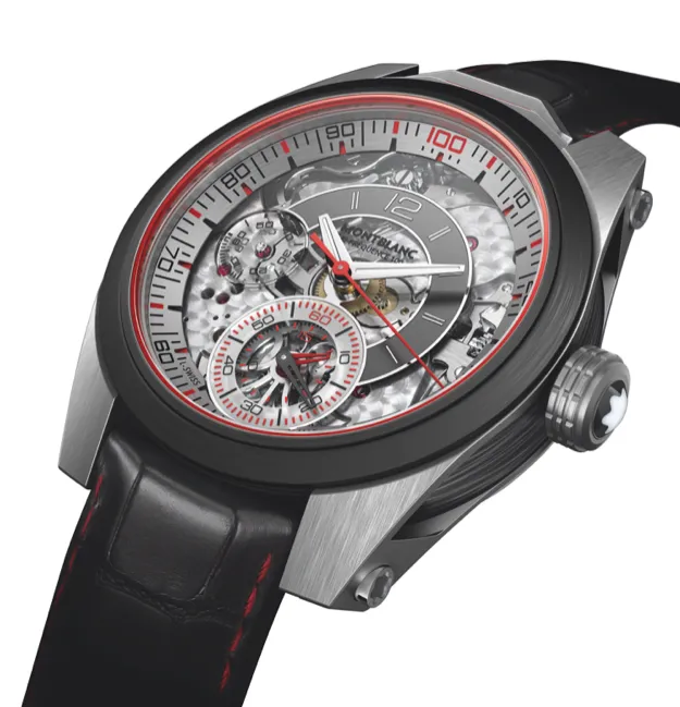 La alta frecuencia de Monbtlanc ha llegado a una frecuencia de 360 mil alternancias por hora, es decir el valor antes mencionado, pero cómo lo logra y cómo llega a vibrar a tal velocidad sin consumir la energía del reloj por completo durante algunos giros, pero lo más interesante, cómo logra pasar imperceptible respecto a la medición de las horas y minutos, pero entregar una correcta cifra del cronógrafo. Bueno, la respuesta estará en que posee un movimiento y dos órganos reguladores. Y sé que prometimos terminar con la descripción, pero hablamos de una estética de titanio, DLC negro, fibra de carbón y acero, materiales que además le brindan un look muy atractivo, #RedMachine.