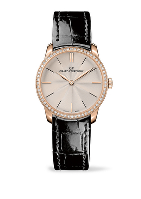 El movimiento automático ultra-fino GP03300 con su diámetro de 111/2’’’ líneas impulsa el modelo de 38 mm que es el de caballero. Este calibre, creado en los talleres de la Manufactura, atesora la longeva tradición de Girard-Perregaux en alta relojería garantizando la máxima fiabilidad y precisión. La platina y los puentes son dibujados, biselados, perlados y decorados con motivos Côtes de Genève. Está compuesto por 205 piezas y ofrece una reserva de marcha de 46 horas que oscila a una frecuencia de 28,800 a/h. Asimismo, el modelo femenino de 30 mm, está impulsado por el movimiento automático GP03200 de 10 1/2’’’ líneas de diámetro, 3.20 mm de grosor y un total de 185 componentes que custodian la masa oscilante en oro rosa 18 quilates, grabada con un elegante “tapiz” formado por el logo de Girard-Perregaux.