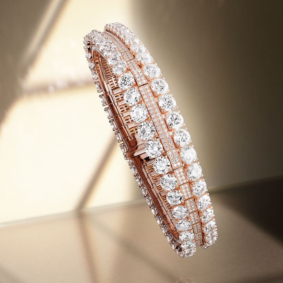 Los 996 diamantes que lo componen (19.7 quilates) se han graduado por tamaño para realzar el efecto tridimensional del diseño, y los engastadores han empleado el engaste con garras y granos para maximizar el juego de luces de las piedras preciosas. El perfil del brazalete también está engastado con diamantes para ensalzar el brillo en mayor medida.