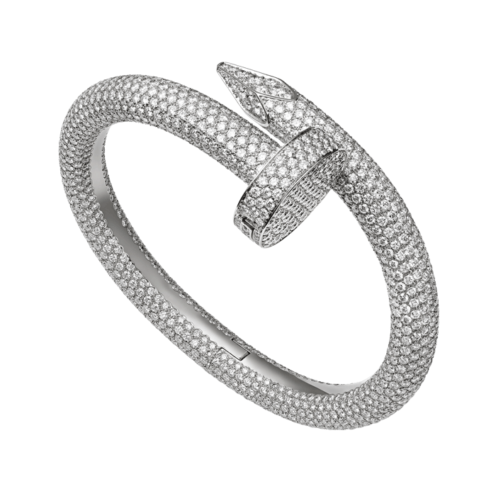 La colección de brazaletes y anillos Juste un Clou de Cartier hoy tiene un nuevo integrante, se trata de un hermoso brazalete engastado en diamantes mediante el cual ha logrado crear una versión ultra-preciosa y espectacular de esta joya esencial, diseñada en los años setenta, en pleno auge creativo neoyorquino.