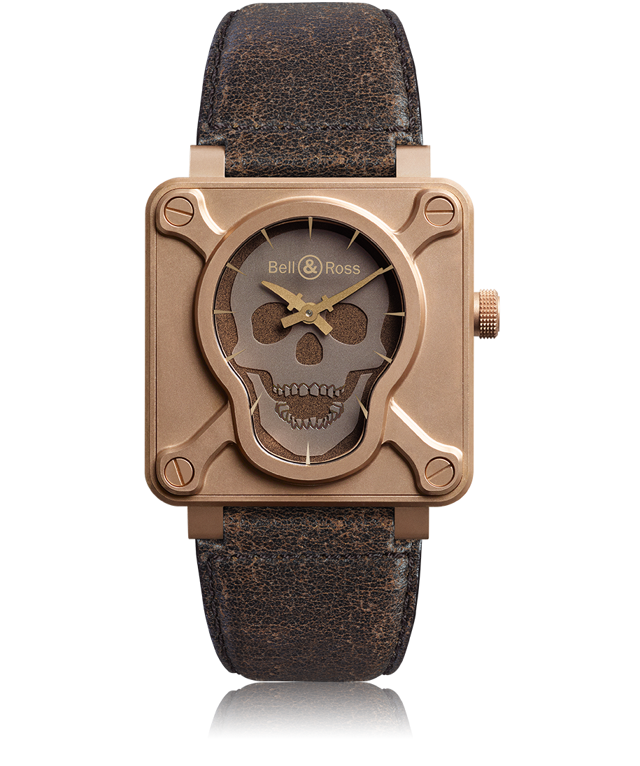 En el caso de Bell & Ross, una empresa que nace de la inspiración en el cockpit de un avión y en sus instrumentos de a bordo, la Segunda Guerra Mundial funge como manantial creativo para la construcción de relojería con espíritu atemporal. Construida en este material, se inspira en la leyenda que las tropas bélicas escribían en sus aviones: “Tête de mort” durante la Segunda Guerra en el desembarco de Normandía. “Death from Above”, o “Muerte desde el cielo” como símbolo místico y de combate. El BR 01 Skull Bronze replica este mensaje y cuenta con una caja de bronce estampada de tal forma que presentará una calavera cruzada por dos huesos en cruz dibujados en el bisel. Asimismo, la carátula está propuesta en cristal de zafiro, que da vida a las horas y minutos, única información propuesta para dicha pieza. En cuestión de características, la caja –de 46 mm– está hecha de una aleación de bronce CuSn8 que adquirirá un look incomparable gracias a la corrosión, mientras que la correa de piel envejecida destaca al conjunto y la intención de sus generadores para lograr ese toque vintage. Finalmente, la pieza es animada por un movimiento mecánico de remonte automático BR-CAL.302.