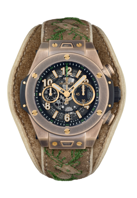 En el marco previo a la celebración tradicional en Bavaria conocida como Oktoberfest, Hublot se ha dado cita para presentar una pieza que celebra las tradiciones de esta comunidad y su pasión por los artículos de precisión llenos de historia. Especialista en combinar el pasado y el futuro a partir del respeto por las tradiciones y el amor por la innovación, Hublot presenta una pieza de cronógrafo que luce caja de bronce y se abraza al pulso mediante una correa de cuero de venado. En el interior vibra un calibre mécanico automático con funciones de cronógrafo y 72 horas de autonomía.