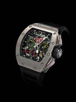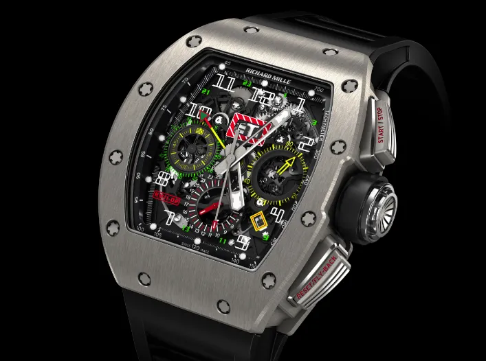 Para los que ya estuvieran familiarizados con la caja original del RM 011, este nuevo reloj es fácilmente reconocible gracias al pulsador adicional situado a las 9 horas y que sirve para ajustar el segundo huso horario. Este pulsador de forma y grabado especiales, así como los situados a las 2 y a las 5 horas y que responden a las funciones inicio/parada y vuelta a cero del cronógrafo, se alinea perfectamente a los apuntes de diseño altamente reconocibles de la colección RM 011, cuyas líneas grabadas se inspiran en la superficie de los pedales de los coches de carreras. A juego con estos apuntes temáticos, Richard Mille también ha diseñado una corona de titanio grado 5 mecanizada de manera altamente precisa y que evoca un mecanismo de embrague, rodeada de un collar de Alcryn que garantiza un excelente contacto táctil.