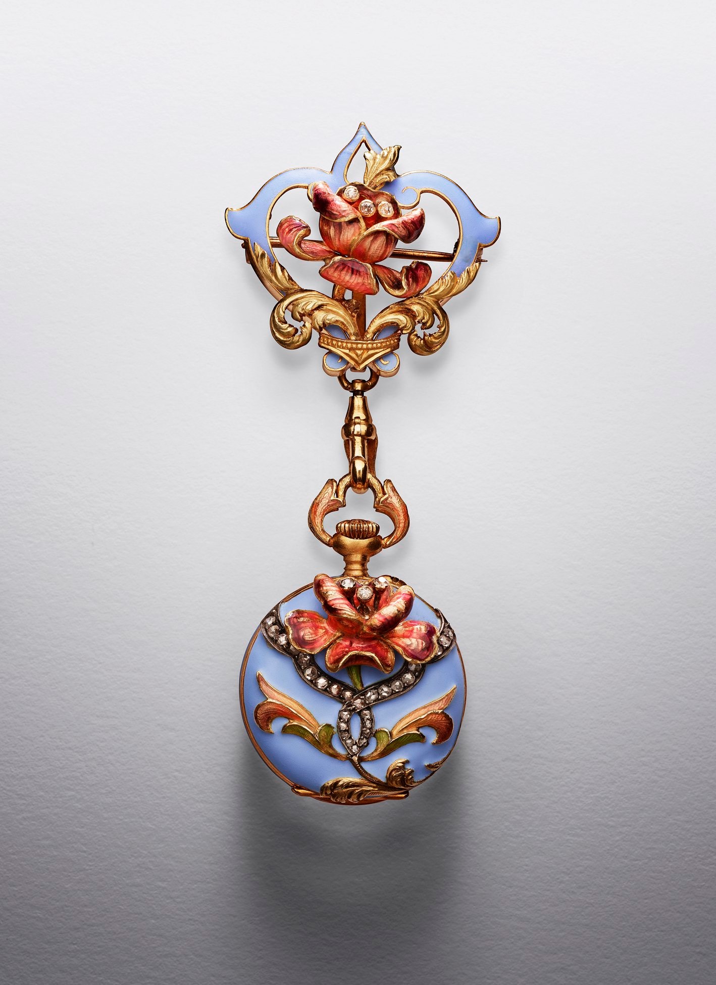 Reloj de broche colgante con motivos florales esmaltados en estilo Art Nouveau, hacia 1910. El Art Nouveau, que surgió en las últimas décadas del siglo XIX, es considerado por algunos como el nacimiento del arte moderno. A diferencia del impresionismo, que se desarrolló al mismo tiempo, el art nouveau no se limitaba a la pintura, sino que buscaba eliminar la distinción entre las bellas artes y las artes decorativas (supuestamente inferiores), abarcando metal, muebles, cerámica, joyas y relojes, textiles y arquitectura. El Art Nouveau fue un movimiento, en lugar de una simple rebelión estilística contra los dictados del Establecimiento artístico; Sus fundamentos filosóficos y éticos reflejaron los profundos cambios sociales, económicos y políticos de las décadas anteriores.