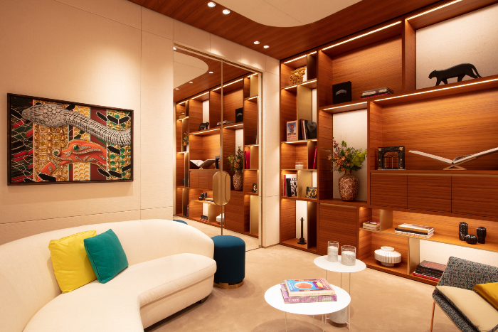 Los códigos de Cartier en cada combinación de materiales. Se notan en las formas de sus techos, vitrinas y hasta en el claro de la escalera que vista de abajo para arriba parece un espiral cuadrado hacia el cielo. Con colecciones completas de joyas y relojes. La Maison lo divide salones especiales y hasta con un segundo piso que aparenta ser más un departamento de recepción de personajes ilustres que una boutique. La experiencia Cartier hoy en México es de las mejores del mundo con esta locación que es la boutique más grande en todo Latinoamérica.